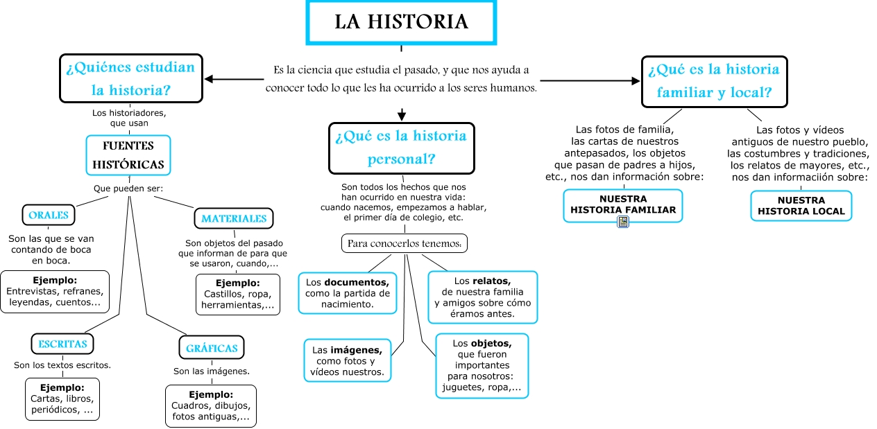 Este Cmap, tiene información relacionada con: LA HISTORIA, Para conocerlos tenemos: ???? Los relatos, de nuestra familia y amigos sobre cómo éramos antes., Que pueden ser: ORALES, ¿Qué es la historia personal? Son todos los hechos que nos han ocurrido en nuestra vida: cuando nacemos, empezamos a hablar, el primer día de colegio, etc. Para conocerlos tenemos:, Para conocerlos tenemos: Las imágenes, como fotos y vídeos nuestros., ¿Quiénes estudian la historia? Los historiadores, que usan FUENTES HISTÓRICAS, LA HISTORIA Es la ciencia que estudia el pasado, y que nos ayuda a conocer todo lo que les ha ocurrido a los seres humanos. ¿Qué es la historia personal?, Que pueden ser: ESCRITAS, Que pueden ser: MATERIALES, ESCRITAS Son los textos escritos. Ejemplo: Cartas, libros, periódicos, ..., Que pueden ser: GRÁFICAS, ¿Qué es la historia familiar y local? Las fotos y vídeos antiguos de nuestro pueblo, las costumbres y tradiciones, los relatos de mayores, etc., nos dan informaciión sobre: NUESTRA HISTORIA LOCAL, ORALES ???? Son las que se van contando de boca en boca., GRÁFICAS Son las imágenes. Ejemplo: Cuadros, dibujos, fotos antiguas,..., LA HISTORIA Es la ciencia que estudia el pasado, y que nos ayuda a conocer todo lo que les ha ocurrido a los seres humanos. ¿Quiénes estudian la historia?, Para conocerlos tenemos: Los documentos, como la partida de nacimiento., MATERIALES Son objetos del pasado que informan de para que se usaron, cuando,... Ejemplo: Castillos, ropa, herramientas,..., Para conocerlos tenemos: Los objetos, que fueron importantes para nosotros: juguetes, ropa,..., LA HISTORIA Es la ciencia que estudia el pasado, y que nos ayuda a conocer todo lo que les ha ocurrido a los seres humanos. ¿Qué es la historia familiar y local?, ¿Qué es la historia familiar y local? Las fotos de familia, las cartas de nuestros antepasados, los objetos que pasan de padres a hijos, etc., nos dan información sobre: NUESTRA HISTORIA FAMILIAR