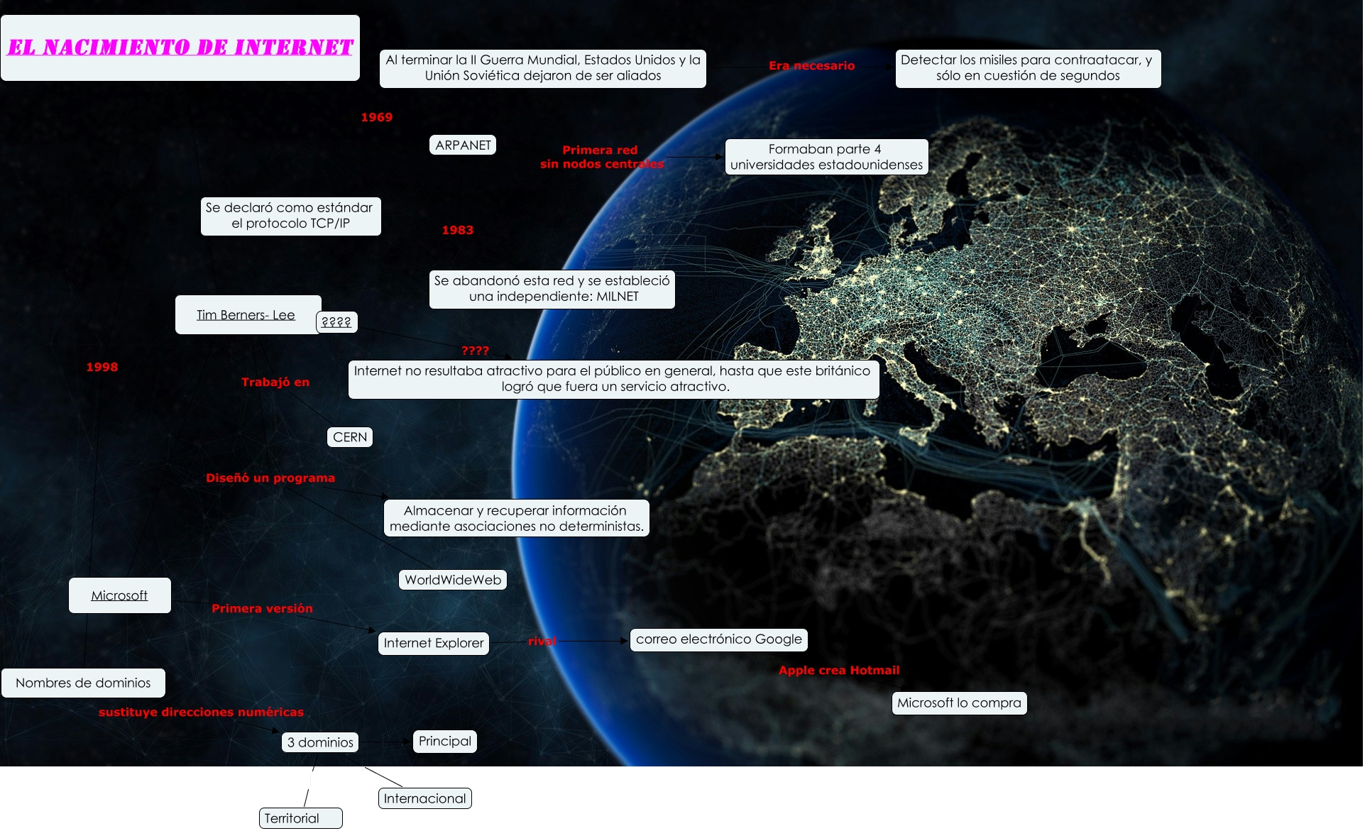 Este Cmap, tiene información relacionada con: Historia de Internet- Pinilla, El nacimiento de Internet 1969 ARPANET, El nacimiento de Internet 1998 Nombres de dominios, correo electrónico Google Apple crea Hotmail Microsoft lo compra, 3 dominios Territorial, El nacimiento de Internet ???? Microsoft, El nacimiento de Internet ???? Al terminar la II Guerra Mundial, Estados Unidos y la Unión Soviética dejaron de ser aliados, Tim Berners- Lee Diseñó un programa Almacenar y recuperar información mediante asociaciones no deterministas., 3 dominios Principal, ARPANET Primera red sin nodos centrales Formaban parte 4 universidades estadounidenses, Al terminar la II Guerra Mundial, Estados Unidos y la Unión Soviética dejaron de ser aliados Era necesario Detectar los misiles para contraatacar, y sólo en cuestión de segundos, Nombres de dominios sustituye direcciones numéricas 3 dominios, Tim Berners- Lee Diseñó un programa WorldWideWeb, ???? ???? Internet no resultaba atractivo para el público en general, hasta que este británico logró que fuera un servicio atractivo., 3 dominios Internacional, Tim Berners- Lee Trabajó en CERN, Microsoft Primera versión Internet Explorer, ARPANET 1983 Se abandonó esta red y se estableció una independiente: MILNET, Internet Explorer rival correo electrónico Google