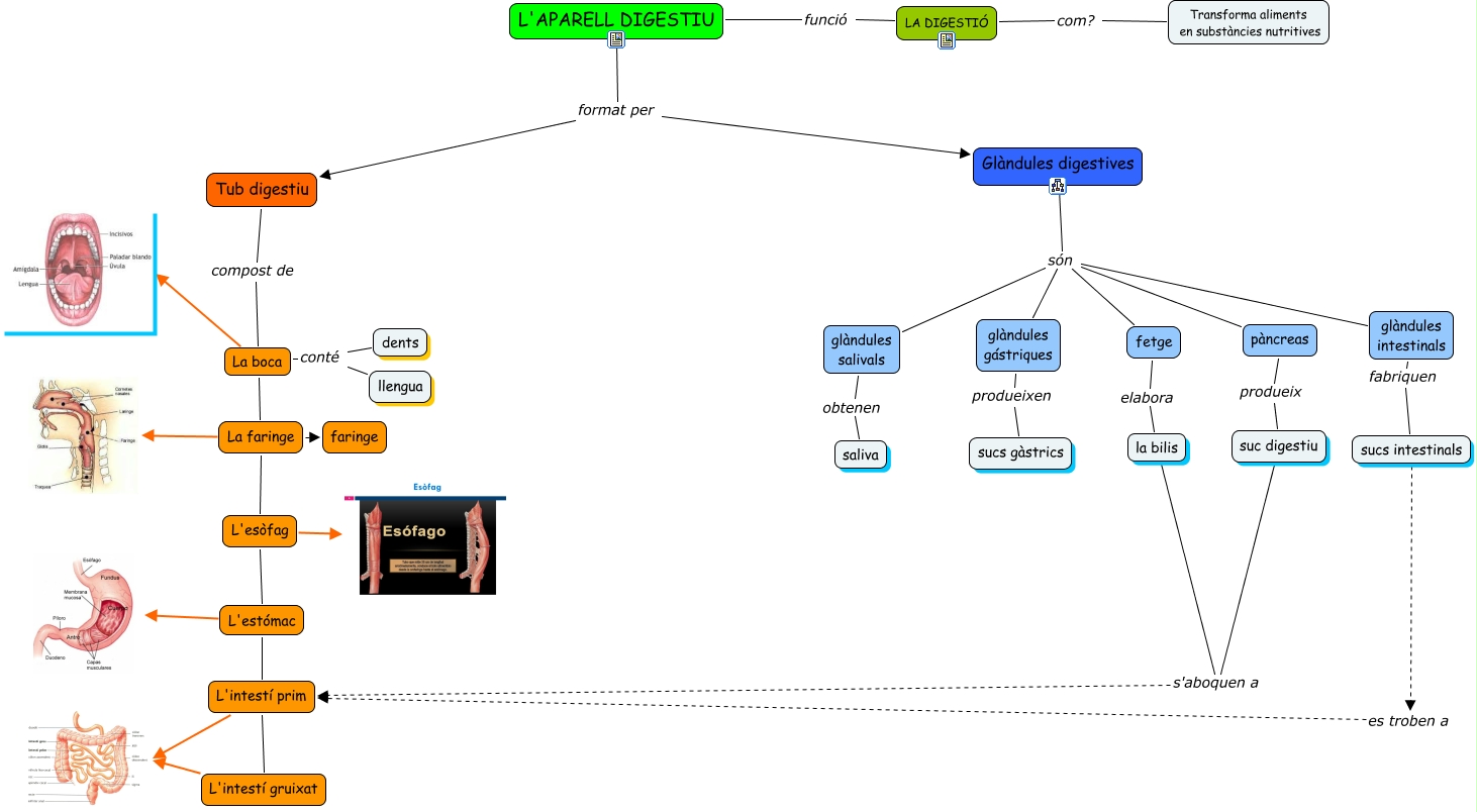 Aquest mapa conceptual conté informació relacionada amb: CPastortT4, L'intestí prim, La boca La faringe, L'intestí gruixat, glàndules gástriques són fetge, LA DIGESTIÓ com? Transforma aliments en substàncies nutritives, La boca conté dents, glàndules gástriques són Glàndules digestives, glàndules salivals obtenen saliva, fetge elabora la bilis, pàncreas produeix suc digestiu, L'esòfag L'estómac, glàndules gástriques produeixen sucs gàstrics, glàndules gástriques són glàndules intestinals, glàndules gástriques són glàndules salivals, La faringe, L'APARELL DIGESTIU funció LA DIGESTIÓ, L'APARELL DIGESTIU format per Tub digestiu, L'APARELL DIGESTIU format per Glàndules digestives, suc digestiu s'aboquen a la bilis, sucs intestinals es troben a L'intestí prim