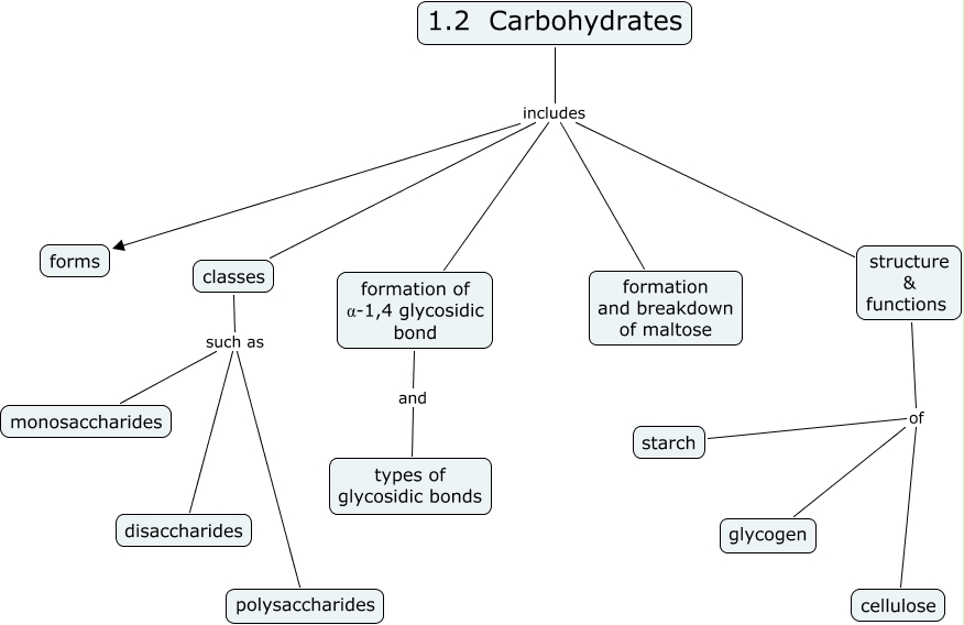 This Concept Map, created with IHMC CmapTools, has information related to: carbohydrates_syllabus, structure & functions of glycogen, structure & functions of starch, 1.2 Carbohydrates includes formation and breakdown of maltose, 1.2 Carbohydrates includes formation of α-1,4 glycosidic bond, classes such as polysaccharides, 1.2 Carbohydrates includes forms, classes such as monosaccharides, structure & functions of cellulose, formation of α-1,4 glycosidic bond and types of glycosidic bonds, classes such as disaccharides, 1.2 Carbohydrates includes classes, 1.2 Carbohydrates includes structure & functions