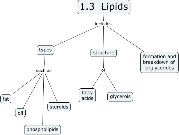 This Concept Map, created with IHMC CmapTools, has information related to: lipids syllabus, 1.3 Lipids includes structure, 1.3 Lipids includes types, types such as steroids, structure of fatty acids, types such as oil, structure of glycerols, types such as fat, 1.3 Lipids includes formation and breakdown of triglycerides, types such as phospholipids