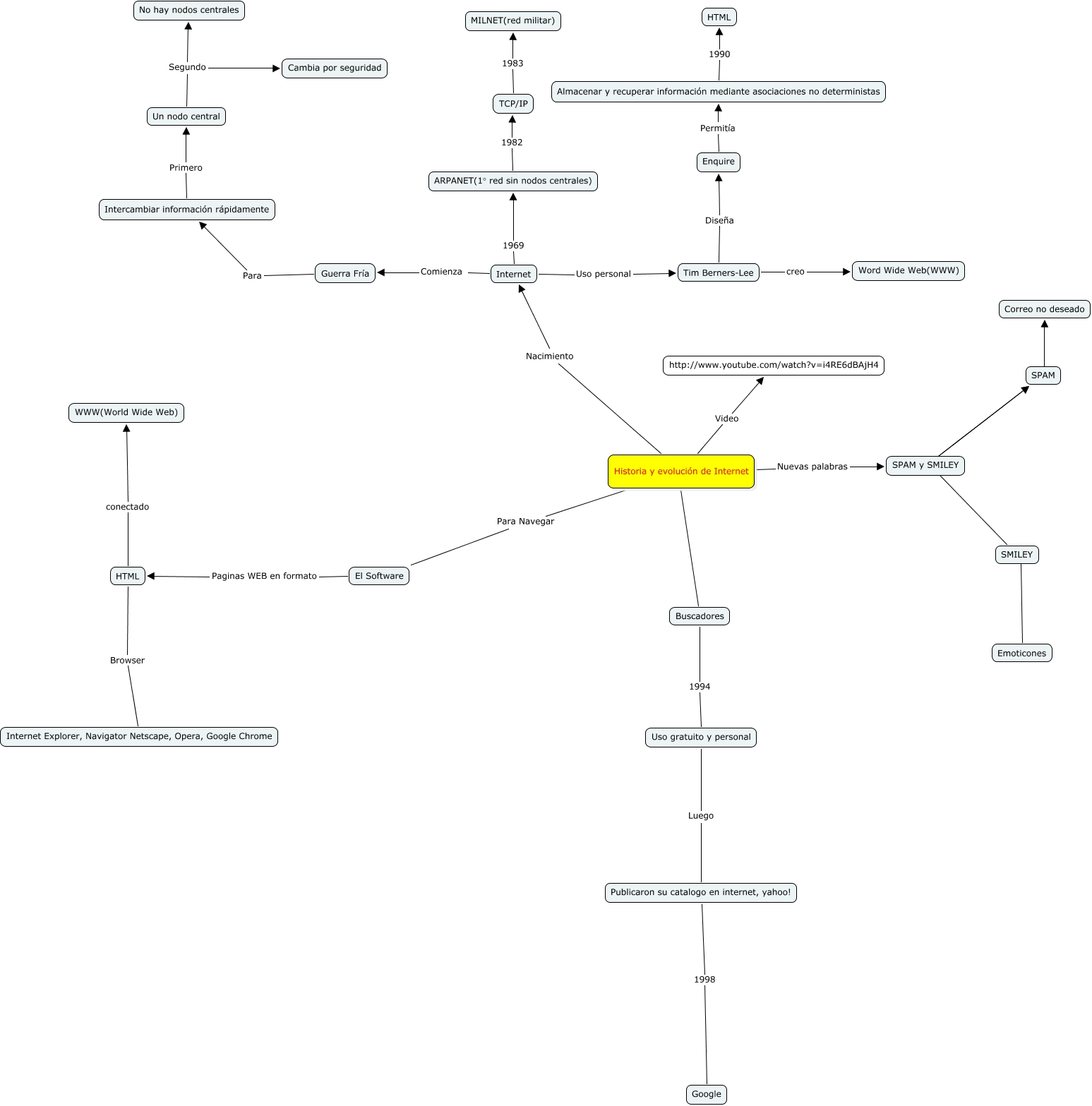 Este Cmap, tiene información relacionada con: Iniaki Historia Internet, Historia y evolución de Internet Nuevas palabras SPAM y SMILEY, Uso gratuito y personal Luego Publicaron su catalogo en internet, yahoo!, Tim Berners-Lee creo Word Wide Web(WWW), Almacenar y recuperar información mediante asociaciones no deterministas 1990 HTML, Internet Uso personal Tim Berners-Lee, Enquire Permitía Almacenar y recuperar información mediante asociaciones no deterministas, Internet 1969 ARPANET(1° red sin nodos centrales), Historia y evolución de Internet Video http://www.youtube.com/watch?v=i4RE6dBAjH4, El Software Paginas WEB en formato HTML, ARPANET(1° red sin nodos centrales) 1982 TCP/IP, Tim Berners-Lee Diseña Enquire, SPAM ???? Correo no deseado, Historia y evolución de Internet Para Navegar El Software, Publicaron su catalogo en internet, yahoo! 1998 Google, HTML Browser Internet Explorer, Navigator Netscape, Opera, Google Chrome, Buscadores 1994 Uso gratuito y personal, SMILEY ???? Emoticones, HTML conectado WWW(World Wide Web), Un nodo central Segundo No hay nodos centrales, Historia y evolución de Internet Buscadores