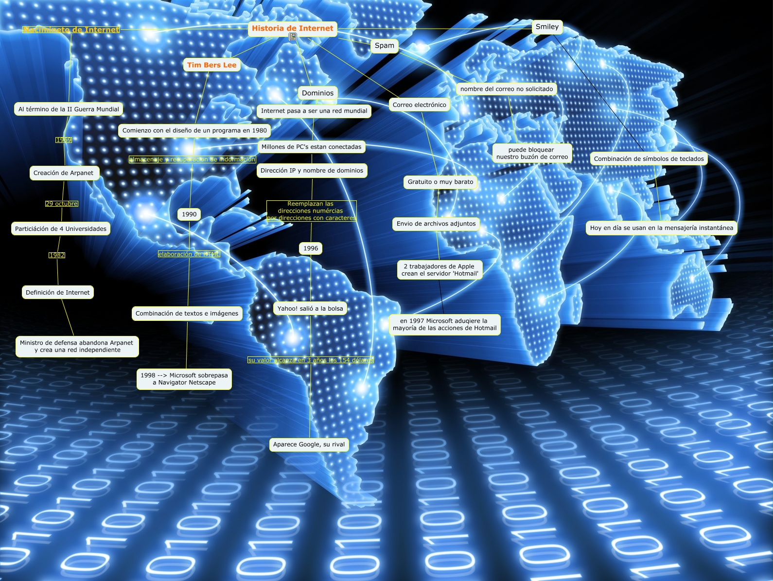 Este Cmap, tiene información relacionada con: Guido Palumbo- El uqe me lo borra lo mato a palasos en el obligo, Correo electrónico ???? Gratuito o muy barato, Comienzo con el diseño de un programa en 1980 almacenaje y recuperacion de indormación 1990, Combinación de textos e imágenes ???? 1998 --> Microsoft sobrepasa a Navigator Netscape, Historia de Internet ???? Smiley, Yahoo! salió a la bolsa su valor alcanza en 3 años los 154 dólares Aparece Google, su rival, Millones de PC's estan conectadas ???? Dirección IP y nombre de dominios, Combinación de símbolos de teclados ???? Hoy en día se usan en la mensajería instantánea, Historia de Internet ???? Spam, Gratuito o muy barato ???? Envio de archivos adjuntos, 1990 elaboración de HTML Combinación de textos e imágenes, nombre del correo no solicitado ???? puede bloquear nuestro buzón de correo, 1996 ???? Yahoo! salió a la bolsa, Al término de la II Guerra Mundial 1969 Creación de Arpanet, Particiáción de 4 Universidades 1982 Definición de Internet, Historia de Internet ???? Dominios, Dominios ???? Internet pasa a ser una red mundial, Historia de Internet ???? Tim Bers Lee, Historia de Internet Nacimineto de Internet Al término de la II Guerra Mundial, 2 trabajadores de Apple crean el servidor 'Hotmail' ???? en 1997 Microsoft aduqiere la mayoría de las acciones de Hotmail, Creación de Arpanet 29 octubre Particiáción de 4 Universidades
