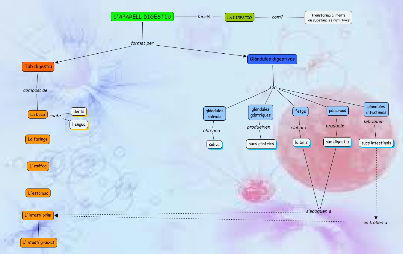 Aquest mapa conceptual conté informació relacionada amb: CPastortT3, glàndules intestinals fabriquen sucs intestinals, L'estómac L'intestí prim, L'APARELL DIGESTIU format per Glàndules digestives, La boca conté dents, glàndules salivals obtenen saliva, suc digestiu s'aboquen a L'intestí prim, glàndules gástriques són glàndules salivals, glàndules gástriques són pàncreas, sucs intestinals es troben a L'intestí prim, glàndules gástriques són glàndules intestinals, L'APARELL DIGESTIU funció LA DIGESTIÓ, La faringe L'esòfag, La boca La faringe, Tub digestiu compost de La boca, La boca conté llengua, LA DIGESTIÓ com? Transforma aliments en substàncies nutritives, glàndules gástriques produeixen sucs gàstrics, L'esòfag L'estómac, L'intestí prim L'intestí gruixat, glàndules gástriques són Glàndules digestives