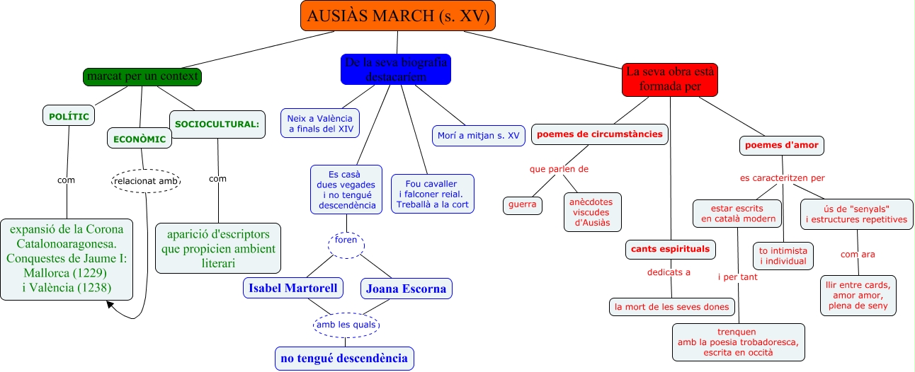 Este Cmap, tiene información relacionada con: Ausiàs March_tasca3, AUSIÀS MARCH (s. XV) De la seva biografia destacaríem Morí a mitjan s. XV, AUSIÀS MARCH (s. XV) De la seva biografia destacaríem Neix a València a finals del XIV, AUSIÀS MARCH (s. XV) La seva obra està formada per poemes de circumstàncies, poemes de circumstàncies que parlen de guerra, poemes de circumstàncies que parlen de anècdotes viscudes d'Ausiàs, Joana Escorna amb les quals no tengué descendència, ECONÒMIC relacionat amb expansió de la Corona Catalonoaragonesa. Conquestes de Jaume I: Mallorca (1229) i València (1238), AUSIÀS MARCH (s. XV) La seva obra està formada per poemes d'amor, Isabel Martorell amb les quals no tengué descendència, AUSIÀS MARCH (s. XV) marcat per un context SOCIOCULTURAL:, poemes d'amor es caracteritzen per to intimista i individual, AUSIÀS MARCH (s. XV) La seva obra està formada per cants espirituals, AUSIÀS MARCH (s. XV) De la seva biografia destacaríem Es casà dues vegades i no tengué descendència, poemes d'amor es caracteritzen per ús de "senyals" i estructures repetitives, cants espirituals dedicats a la mort de les seves dones, AUSIÀS MARCH (s. XV) marcat per un context ECONÒMIC, estar escrits en català modern i per tant trenquen amb la poesia trobadoresca, escrita en occità, Es casà dues vegades i no tengué descendència foren Isabel Martorell, ús de "senyals" i estructures repetitives com ara llir entre cards, amor amor, plena de seny, AUSIÀS MARCH (s. XV) marcat per un context POLÍTIC