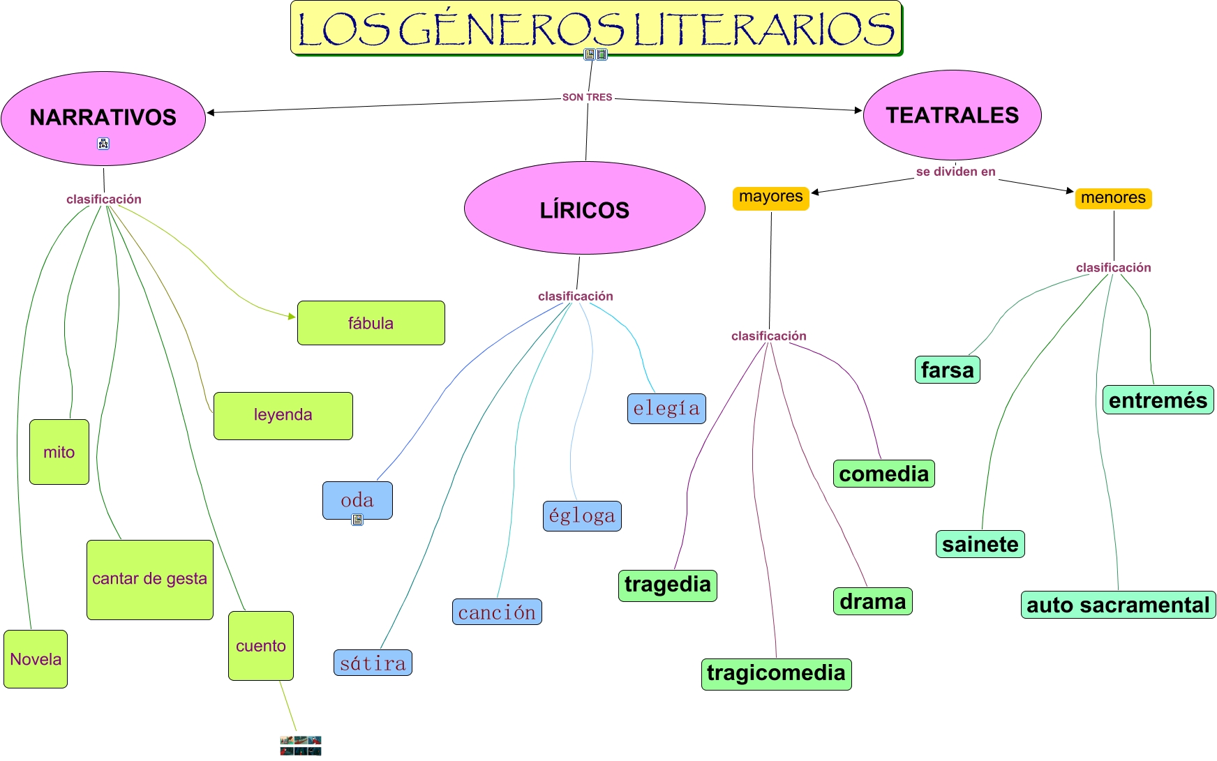 Este Cmap, tiene información relacionada con: géneros literarios, menores clasificación auto sacramental, menores clasificación sainete, NARRATIVOS clasificación mito, mayores clasificación tragedia, LÍRICOS clasificación canción, cuento ????, mayores clasificación tragicomedia, LÍRICOS clasificación égloga, mayores clasificación drama, LOS GÉNEROS LITERARIOS SON TRES TEATRALES, NARRATIVOS clasificación cantar de gesta, TEATRALES se dividen en mayores, LOS GÉNEROS LITERARIOS SON TRES NARRATIVOS, LÍRICOS clasificación sátira, NARRATIVOS clasificación cuento, menores clasificación farsa, LÍRICOS clasificación elegía, NARRATIVOS clasificación fábula, LOS GÉNEROS LITERARIOS SON TRES LÍRICOS, NARRATIVOS clasificación leyenda