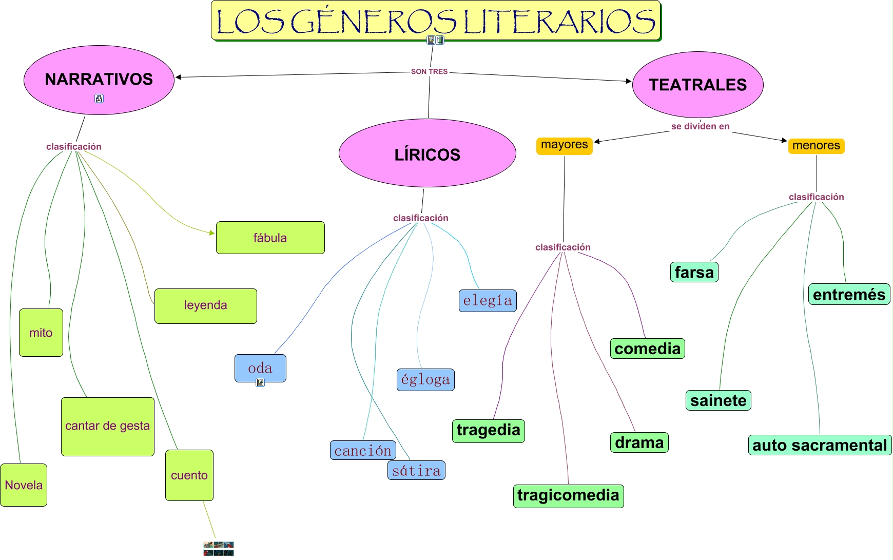 Este Cmap, tiene información relacionada con: géneros literarios, menores clasificación auto sacramental, menores clasificación sainete, NARRATIVOS clasificación mito, mayores clasificación tragedia, LÍRICOS clasificación canción, cuento ????, mayores clasificación tragicomedia, LÍRICOS clasificación égloga, mayores clasificación drama, LOS GÉNEROS LITERARIOS SON TRES TEATRALES, NARRATIVOS clasificación cantar de gesta, TEATRALES se dividen en mayores, LOS GÉNEROS LITERARIOS SON TRES NARRATIVOS, LÍRICOS clasificación sátira, NARRATIVOS clasificación cuento, menores clasificación farsa, LÍRICOS clasificación elegía, NARRATIVOS clasificación fábula, LOS GÉNEROS LITERARIOS SON TRES LÍRICOS, NARRATIVOS clasificación leyenda