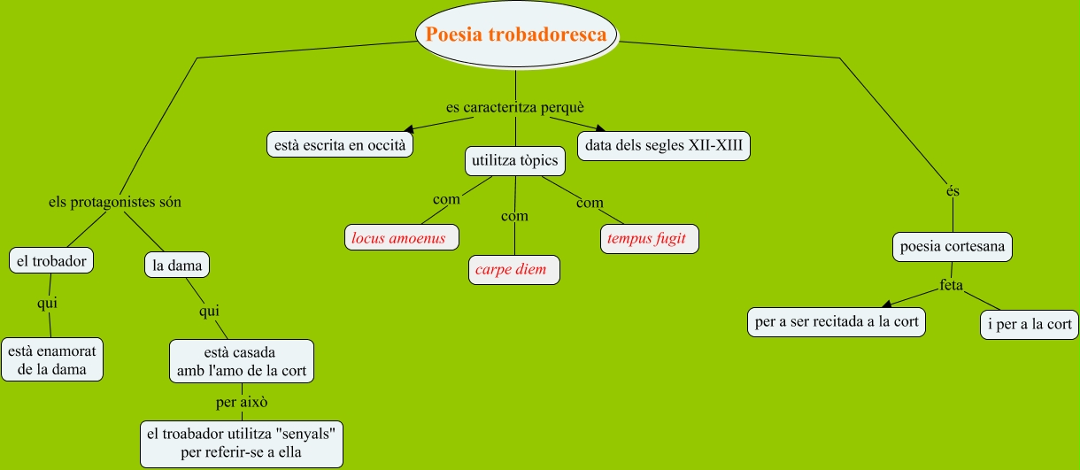 Este Cmap, tiene información relacionada con: Tasca 5, el trobador qui està enamorat de la dama, Poesia trobadoresca els protagonistes són el trobador, la dama qui està casada amb l'amo de la cort, Poesia trobadoresca és poesia cortesana, Poesia trobadoresca es caracteritza perquè utilitza tòpics, Poesia trobadoresca es caracteritza perquè data dels segles XII-XIII, utilitza tòpics com locus amoenus, utilitza tòpics com carpe diem, està casada amb l'amo de la cort per això el troabador utilitza "senyals" per referir-se a ella, Poesia trobadoresca els protagonistes són la dama, poesia cortesana feta i per a la cort, Poesia trobadoresca es caracteritza perquè està escrita en occità, utilitza tòpics com tempus fugit, poesia cortesana feta per a ser recitada a la cort
