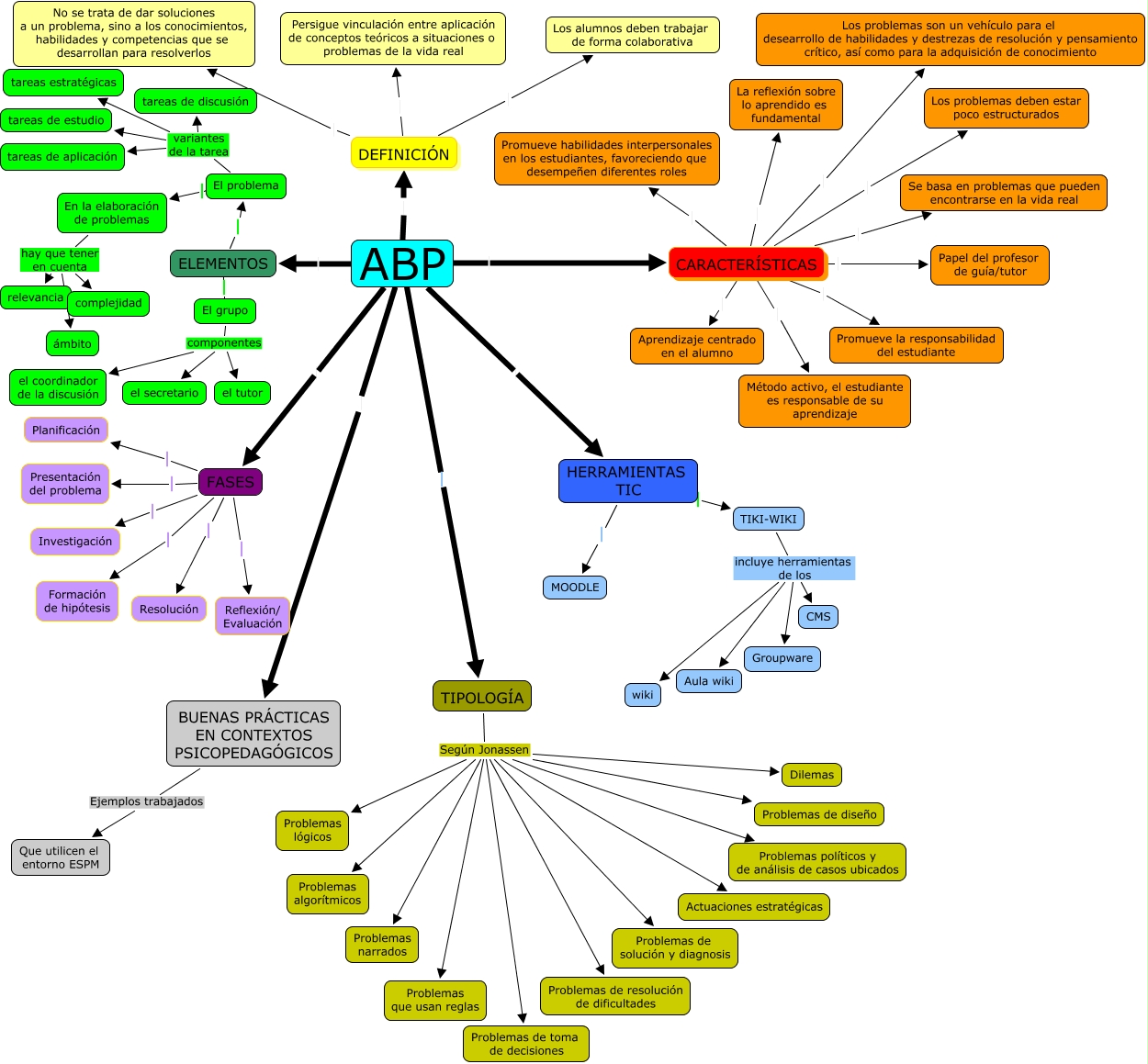 Este Cmap, tiene información relacionada con: ABP, ELEMENTOS El problema, ABP HERRAMIENTAS TIC, CARACTERÍSTICAS Promueve habilidades interpersonales en los estudiantes, favoreciendo que desempeñen diferentes roles, TIPOLOGÍA Según Jonassen Problemas de toma de decisiones, TIPOLOGÍA Según Jonassen Problemas lógicos, CARACTERÍSTICAS Los problemas son un vehículo para el desearrollo de habilidades y destrezas de resolución y pensamiento crítico, así como para la adquisición de conocimiento, DEFINICIÓN No se trata de dar soluciones a un problema, sino a los conocimientos, habilidades y competencias que se desarrollan para resolverlos, TIKI-WIKI incluye herramientas de los CMS, En la elaboración de problemas hay que tener en cuenta ámbito, TIPOLOGÍA Según Jonassen Problemas de diseño, ABP ELEMENTOS, TIPOLOGÍA Según Jonassen Dilemas, TIPOLOGÍA Según Jonassen Problemas algorítmicos, CARACTERÍSTICAS Los problemas deben estar poco estructurados, CARACTERÍSTICAS La reflexión sobre lo aprendido es fundamental, El problema variantes de la tarea tareas de aplicación, CARACTERÍSTICAS Método activo, el estudiante es responsable de su aprendizaje, CARACTERÍSTICAS Se basa en problemas que pueden encontrarse en la vida real, ABP FASES, FASES Reflexión/ Evaluación