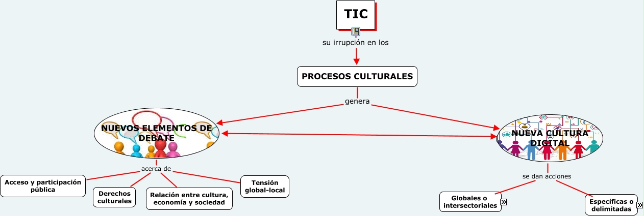 Este Cmap, tiene información relacionada con: dimensión cultural de las TIC_Noelia Banchio, NUEVOS ELEMENTOS DE DEBATE acerca de Relación entre cultura, economía y sociedad, NUEVOS ELEMENTOS DE DEBATE ????, Específicas o delimitadas incluyen Acceso a servicios e instituciones patrimoniales, NUEVOS ELEMENTOS DE DEBATE acerca de Tensión global-local, líneas de dinamización cultural a través de consulta de catálogos y fondos, líneas de dinamización cultural a través de exposición y difusión de contenidos y programación, Estrategias básicas y universales por ejemplo web publishing, foros, chats, weblogs, listas de correo, líneas de dinamización cultural a través de interconexión de contenidos, PROCESOS CULTURALES genera NUEVA CULTURA DIGITAL, PROCESOS CULTURALES genera NUEVOS ELEMENTOS DE DEBATE, Software libre debates y acciones sobre difusión y acceso, idoneidad, estrategias en favor de la diversidad cultural, Específicas o delimitadas incluyen Net Art, Globales o intersectoriales incluyen Software libre, Internet radio y tv promueve acciones culturales alternativas, Net Art proceso de creación abierta y colectiva, Acceso a servicios e instituciones patrimoniales generando líneas de dinamización cultural, TIC su irrupción en los PROCESOS CULTURALES, Específicas o delimitadas incluyen Intercambio en red, Específicas o delimitadas incluyen Internet radio y tv, NUEVA CULTURA DIGITAL se dan acciones Globales o intersectoriales