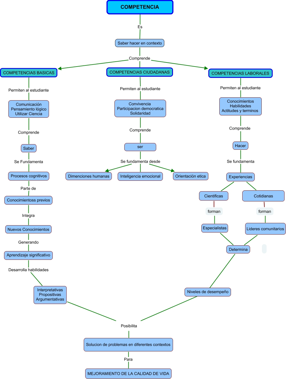 Este Cmap, tiene información relacionada con: COMPETENCIA, Determina Posibilita Solucion de problemas en diferentes contextos, Saber Se Fundamenta Procesos cognitivos, forman Especialistas Determina, Aprendizaje significativo Desarrolla habilidades Interpretativas Propositivas Argumentativas, Experiencias Cotidianas forman, ser Se fundamenta desde Dimenciones humanas, Solucion de problemas en diferentes contextos Para MEJORAMIENTO DE LA CALIDAD DE VIDA, COMPETENCIAS LABORALES Permiten al estudiante Conocimientos Habilidades Actitudes y terminos, Experiencias Cientificas forman, Hacer Se fundamenta Experiencias, ser Se fundamenta desde Inteligencia emocional, COMPETENCIAS CIUDADANAS Permiten al estudiante Convivencia Participacion democratica Solidaridad, Saber hacer en contexto Comprende COMPETENCIAS CIUDADANAS, Interpretativas Propositivas Argumentativas Posibilita Solucion de problemas en diferentes contextos, Conocimientoss previos Integra Nuevos Conocimientos, Procesos cognitivos Parte de Conocimientoss previos, COMPETENCIA Es Saber hacer en contexto, Comunicación Pensamiento lógico Utilizar Ciencia Comprende Saber, Convivencia Participacion democratica Solidaridad Comprende ser, Nuevos Conocimientos Generando Aprendizaje significativo
