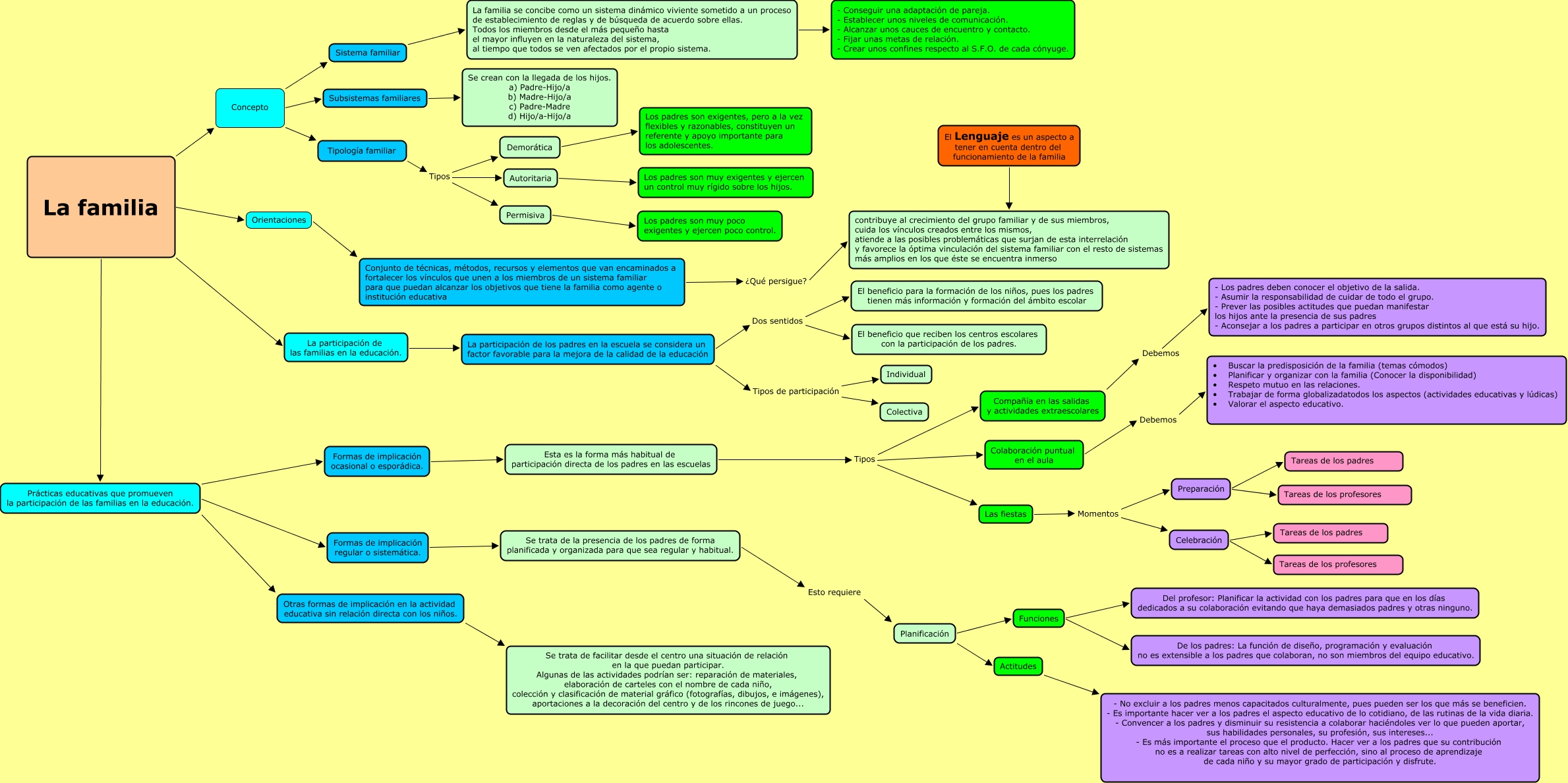 Este Cmap, tiene información relacionada con: practica6, Formas de implicación ocasional o esporádica. Esta es la forma más habitual de participación directa de los padres en las escuelas, Prácticas educativas que promueven la participación de las familias en la educación. Formas de implicación regular o sistemática., El Lenguaje es un aspecto a tener en cuenta dentro del funcionamiento de la familia contribuye al crecimiento del grupo familiar y de sus miembros, cuida los vínculos creados entre los mismos, atiende a las posibles problemáticas que surjan de esta interrelación y favorece la óptima vinculación del sistema familiar con el resto de sistemas más amplios en los que éste se encuentra inmerso, Compañía en las salidas y actividades extraescolares Debemos - Los padres deben conocer el objetivo de la salida. - Asumir la responsabilidad de cuidar de todo el grupo. - Prever las posibles actitudes que puedan manifestar los hijos ante la presencia de sus padres - Aconsejar a los padres a participar en otros grupos distintos al que está su hijo., La familia Prácticas educativas que promueven la participación de las familias en la educación., La participación de los padres en la escuela se considera un factor favorable para la mejora de la calidad de la educación Tipos de participación Colectiva, Concepto Subsistemas familiares, Planificación Funciones, Celebración Tareas de los padres, Funciones Del profesor: Planificar la actividad con los padres para que en los días dedicados a su colaboración evitando que haya demasiados padres y otras ninguno., Funciones De los padres: La función de diseño, programación y evaluación no es extensible a los padres que colaboran, no son miembros del equipo educativo., Esta es la forma más habitual de participación directa de los padres en las escuelas Tipos Las fiestas, Orientaciones Conjunto de técnicas, métodos, recursos y elementos que van encaminados a fortalecer los vínculos que unen a los miembros de un sistema familiar para que puedan alcanzar los objetivos que tiene la familia como agente o institución educativa, Esta es la forma más habitual de participación directa de los padres en las escuelas Tipos Colaboración puntual en el aula, Las fiestas Momentos Celebración, Actitudes - No excluir a los padres menos capacitados culturalmente, pues pueden ser los que más se beneficien. - Es importante hacer ver a los padres el aspecto educativo de lo cotidiano, de las rutinas de la vida diaria. - Convencer a los padres y disminuir su resistencia a colaborar haciéndoles ver lo que pueden aportar, sus habilidades personales, su profesión, sus intereses... - Es más importante el proceso que el producto. Hacer ver a los padres que su contribución no es a realizar tareas con alto nivel de perfección, sino al proceso de aprendizaje de cada niño y su mayor grado de participación y disfrute., Preparación Tareas de los profesores, Las fiestas Momentos Preparación, Planificación Actitudes, Colaboración puntual en el aula Debemos • Buscar la predisposición de la familia (temas cómodos) • Planificar y organizar con la familia (Conocer la disponibilidad) • Respeto mutuo en las relaciones. • Trabajar de forma globalizada todos los aspectos (actividades educativas y lúdicas) • Valorar el aspecto educativo.