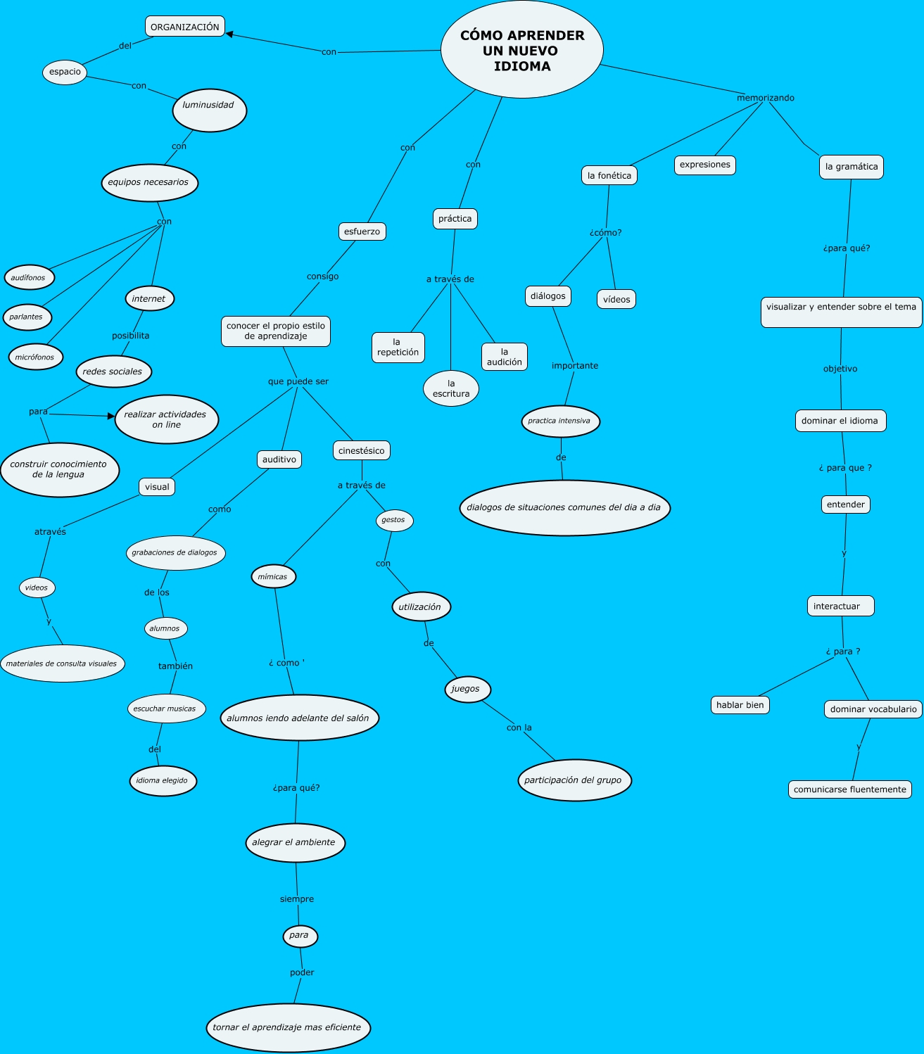 Esse mapa conceitual, produzido no IHMC CmapTools, tem a informação relacionada a: mapa colaborativo, ORGANIZACIÓN del espacio, esfuerzo consigo conocer el propio estilo de aprendizaje, alegrar el ambiente siempre para, equipos necesarios con micrófonos, visual através videos, cinestésico a través de gestos, dominar vocabulario y comunicarse fluentemente, CÓMO APRENDER UN NUEVO IDIOMA con ORGANIZACIÓN, interactuar ¿ para ? dominar vocabulario, espacio con luminusidad, equipos necesarios con parlantes, CÓMO APRENDER UN NUEVO IDIOMA memorizando la gramática, alumnos iendo adelante del salón ¿para qué? alegrar el ambiente, CÓMO APRENDER UN NUEVO IDIOMA con esfuerzo, visualizar y entender sobre el tema objetivo dominar el idioma, práctica a través de la repetición, videos y materiales de consulta visuales, luminusidad con equipos necesarios, auditivo como grabaciones de dialogos, grabaciones de dialogos de los alumnos