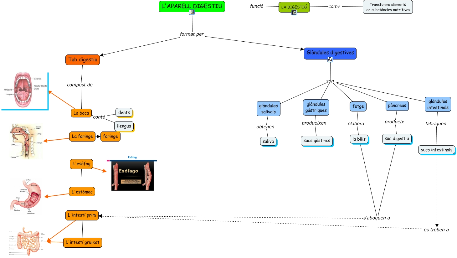 Aquest mapa conceptual conté informació relacionada amb: CPastortT5, L'intestí prim, La boca La faringe, L'intestí gruixat, glàndules gástriques són fetge, LA DIGESTIÓ com? Transforma aliments en substàncies nutritives, La boca conté dents, glàndules gástriques són Glàndules digestives, glàndules salivals obtenen saliva, fetge elabora la bilis, pàncreas produeix suc digestiu, L'esòfag L'estómac, glàndules gástriques produeixen sucs gàstrics, glàndules gástriques són glàndules intestinals, glàndules gástriques són glàndules salivals, La faringe, L'APARELL DIGESTIU funció LA DIGESTIÓ, L'APARELL DIGESTIU format per Tub digestiu, L'APARELL DIGESTIU format per Glàndules digestives, suc digestiu s'aboquen a la bilis, sucs intestinals es troben a L'intestí prim