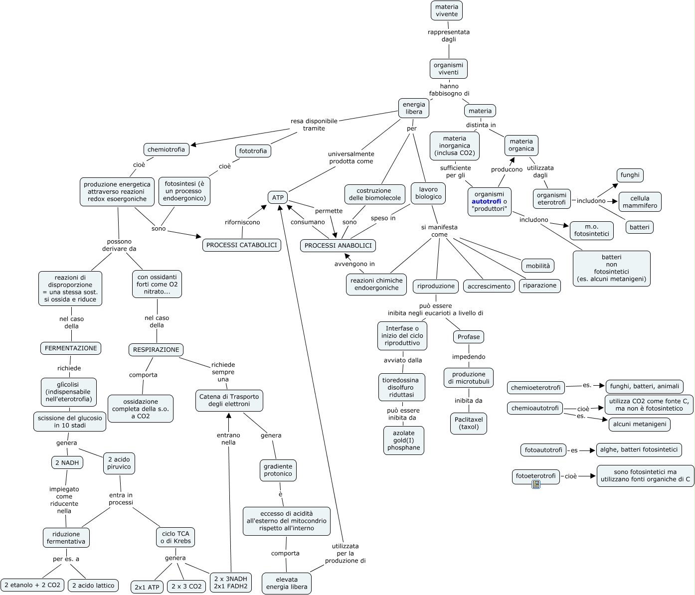 Questa Cmap, creata con IHMC CmapTools, contiene informazioni relative a: Metabolismo_5CH, PROCESSI CATABOLICI riforniscono ATP, eccesso di acidità all'esterno del mitocondrio rispetto all'interno comporta elevata energia libera, energia libera resa disponibile tramite chemiotrofia, produzione energetica attraverso reazioni redox esoergoniche possono derivare da con ossidanti forti come O2 nitrato..., Interfase o inizio del ciclo riproduttivo avviato dalla tioredossina disolfuro riduttasi, riproduzione può essere inibita negli eucarioti a livello di Profase, energia libera per costruzione delle biomolecole, FERMENTAZIONE richiede glìcolisi (indispensabile nell'eterotrofia), RESPIRAZIONE richiede sempre una Catena di Trasporto degli elettroni, produzione di microtubuli inibita da Paclitaxel (taxol), RESPIRAZIONE comporta ossidazione completa della s.o. a CO2, lavoro biologico speso in PROCESSI ANABOLICI, riproduzione può essere inibita negli eucarioti a livello di Interfase o inizio del ciclo riproduttivo, materia distinta in materia inorganica (inclusa CO2), energia libera resa disponibile tramite fototrofia, materia inorganica (inclusa CO2) sufficiente per gli organismi autotrofi o "produttori", tioredossina disolfuro riduttasi può essere inibita da azolate gold(I) phosphane, fotoeterotrofi cioè sono fotosintetici ma utilizzano fonti organiche di C, organismi eterotrofi includono batteri, lavoro biologico si manifesta come riparazione