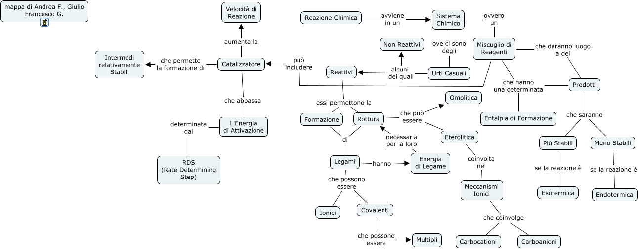 Questa Cmap, creata con IHMC CmapTools, contiene informazioni relative a: reazioni_E, Sistema Chimico ove ci sono degli Urti Casuali, Legami hanno Energia di Legame, L'Energia di Attivazione determinata dal RDS (Rate Determining Step), Catalizzatore aumenta la Velocità di Reazione, Miscuglio di Reagenti può includere Catalizzatore, Prodotti che saranno Più Stabili, Meccanismi Ionici che coinvolge Carboanioni, Urti Casuali alcuni dei quali Non Reattivi, Rottura che può essere Omolitica, Prodotti che saranno Meno Stabili, Reattivi essi permettono la Rottura, Meccanismi Ionici che coinvolge Carbocationi, Catalizzatore che abbassa L'Energia di Attivazione, Meno Stabili se la reazione è Endotermica, Rottura di Legami, Sistema Chimico ovvero un Miscuglio di Reagenti, Legami che possono essere Covalenti, Legami che possono essere Ionici, Reattivi essi permettono la Formazione, Miscuglio di Reagenti che daranno luogo a dei Prodotti