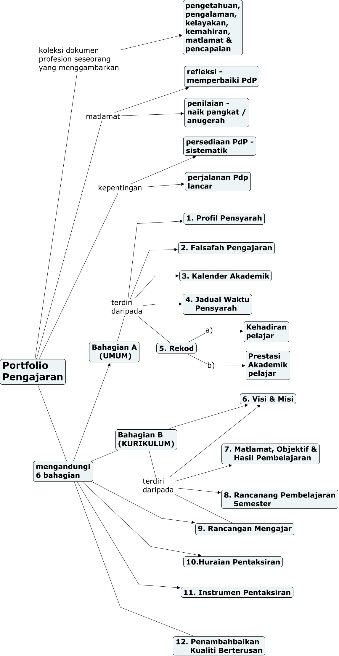 This Concept Map, created with IHMC CmapTools, has information related to: Teaching Portfolio, Bahagian B (KURIKULUM) terdiri daripada 7. Matlamat, Objektif & Hasil Pembelajaran, Portfolio Pengajaran 12. Penambahbaikan Kualiti Berterusan, Portfolio Pengajaran matlamat refleksi - memperbaiki PdP, Bahagian A (UMUM) terdiri daripada 4. Jadual Waktu Pensyarah, Bahagian A (UMUM) terdiri daripada 5. Rekod, Bahagian A (UMUM) terdiri daripada 2. Falsafah Pengajaran, Bahagian A (UMUM) terdiri daripada 3. Kalender Akademik, Portfolio Pengajaran kepentingan perjalanan Pdp lancar, Bahagian B (KURIKULUM) terdiri daripada 9. Rancangan Mengajar, Portfolio Pengajaran 9. Rancangan Mengajar, Portfolio Pengajaran koleksi dokumen profesion seseorang yang menggambarkan pengetahuan, pengalaman, kelayakan, kemahiran, matlamat & pencapaian, Portfolio Pengajaran 10.Huraian Pentaksiran, Portfolio Pengajaran 11. Instrumen Pentaksiran, Portfolio Pengajaran kepentingan persediaan PdP - sistematik, Bahagian B (KURIKULUM) terdiri daripada 6. Visi & Misi, Portfolio Pengajaran 6. Visi & Misi, Bahagian A (UMUM) terdiri daripada 1. Profil Pensyarah, 5. Rekod b) Prestasi Akademik pelajar, Portfolio Pengajaran matlamat penilaian - naik pangkat / anugerah, Portfolio Pengajaran Bahagian A (UMUM)