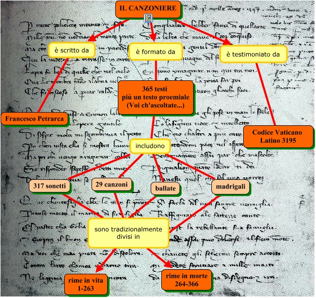 Questa Cmap, creata con IHMC CmapTools, contiene informazioni relative a: Il Canzoniere, IL CANZONIERE è testimoniato da Codice Vaticano Latino 3195, 29 canzoni sono tradizionalmente divisi in rime in vita 1-263, 29 canzoni sono tradizionalmente divisi in rime in morte 264-366, IL CANZONIERE è scritto da Francesco Petrarca, IL CANZONIERE è formato da 365 testi più un testo proemiale (Voi ch'ascoltate...), 365 testi più un testo proemiale (Voi ch'ascoltate...) includono 317 sonetti, madrigali sono tradizionalmente divisi in rime in vita 1-263, 317 sonetti sono tradizionalmente divisi in rime in morte 264-366, 365 testi più un testo proemiale (Voi ch'ascoltate...) includono 29 canzoni, 365 testi più un testo proemiale (Voi ch'ascoltate...) includono madrigali, 317 sonetti sono tradizionalmente divisi in rime in vita 1-263, madrigali sono tradizionalmente divisi in rime in morte 264-366, ballate sono tradizionalmente divisi in rime in morte 264-366, ballate sono tradizionalmente divisi in rime in vita 1-263, 365 testi più un testo proemiale (Voi ch'ascoltate...) includono ballate