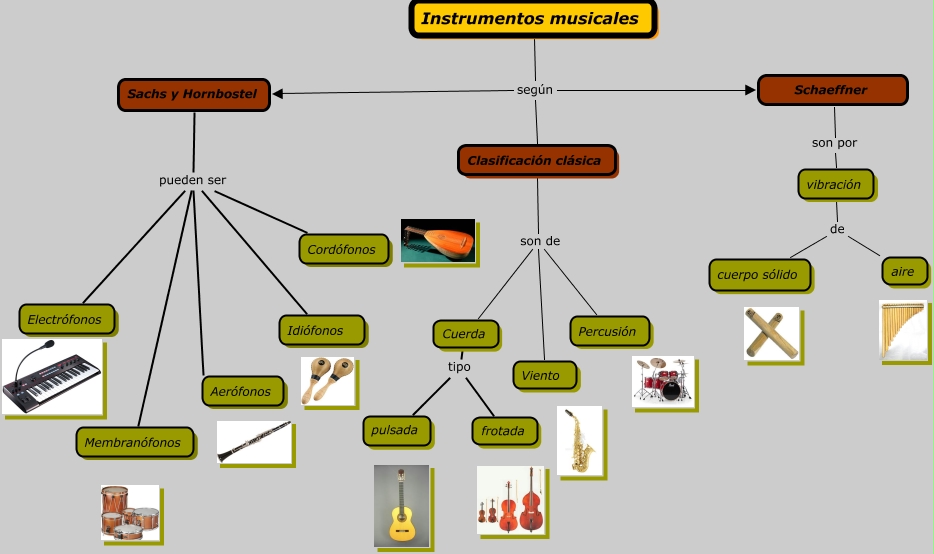 Este Cmap, tiene información relacionada con: mapa conceptual inst-mus.cmap, Sachs y Hornbostel pueden ser Aerófonos, Cuerda tipo pulsada, vibración de aire, Instrumentos musicales según Clasificación clásica, Sachs y Hornbostel pueden ser Electrófonos, Schaeffner son por vibración, Sachs y Hornbostel pueden ser Cordófonos, Instrumentos musicales según Sachs y Hornbostel, Clasificación clásica son de Percusión, Instrumentos musicales según Schaeffner, Sachs y Hornbostel pueden ser Membranófonos, Clasificación clásica son de Viento, Sachs y Hornbostel pueden ser Idiófonos, Cuerda tipo frotada, vibración de cuerpo sólido, Clasificación clásica son de Cuerda