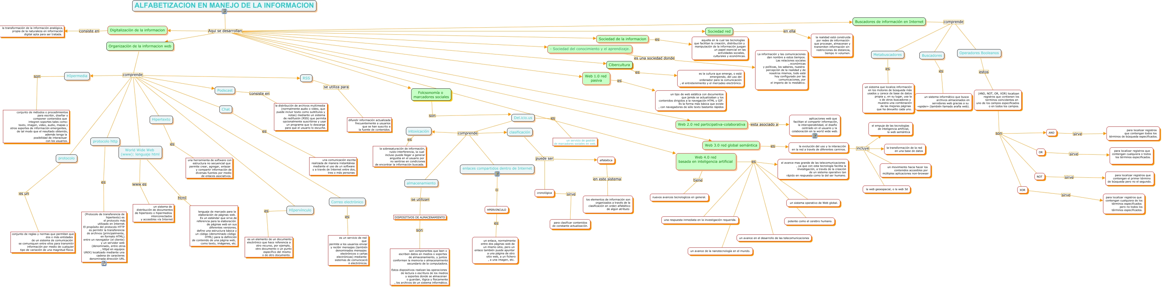 Este Cmap, tiene información relacionada con: KENIG Y TIRANTI Y MATIAS, Organizaciòn de la informacion web comprende Podscast, ALFABETIZACION EN MANEJO DE LA INFORMACION Aqui se desarrollan Web 2.0 red participativa-colaborativa, DISPOSITIVOS DE ALMACENAMIENTO son son componentes que leen o escriben datos en medios o soportes de almacenamiento, y juntos conforman la memoria o almacenamiento secundario de la computadora. Estos dispositivos realizan las operaciones de lectura o escritura de los medios y soportes donde se almacenan o guardan, lógica y físicamente , los archivos de un sistema informático., HIpervìnculo es es un elemento de un documento electrónico que hace referencia a otro recurso, por ejemplo, otro documento o un punto específico del mismo o de otro documento., Web 4.0 red basada en inteligencia artificial es un sistema operativo de Web global., Sociedad red en ella la realidad está construida por redes de información que procesan, almacenan y transmiten información sin restricciones de distancia, tiempo ni volumen., Digitalizaciòn de la informacion consiste en la transformación de la información analógica, propia de la naturaleza en información digital apta para ser tratada., clasificación puede ser cronológica, Sociedad de la informacion es aquella en la cual las tecnologías que facilitan la creación, distribución y manipulación de la información juegan un papel esencial en las actividades sociales, culturales y económicas., Organizaciòn de la informacion web comprende RSS, la evolución del uso y la interacción en la red a través de diferentes caminos. incluye el empuje de las tecnologías de inteligencia artificial, la web semántica, Organizaciòn de la informacion web comprende Correo electrònico, Correo electrònico es es un servicio de red que permite a los usuarios enviar y recibir mensajes (también denominados mensajes electrónicos o cartas electrónicas) mediante sistemas de comunicació n electrónicos., XOR sirve para localizar registros que contengan cualquiera de los términos especificados pero no todos los términos especificados., Web 3.0 red global semántica es la evolución del uso y la interacción en la red a través de diferentes caminos., NOT sirve para localizar registros que contengan el primer término de búsqueda pero no el segundo., Web 4.0 red basada en inteligencia artificial es un avance en el desarrollo de las telecomunicaciones, Web 4.0 red basada en inteligencia artificial es potente como el cerebro humano., ALFABETIZACION EN MANEJO DE LA INFORMACION Aqui se desarrollan Buscadores de información en Internet, (AND, NOT, OR, XOR) localizan registros que contienen los terminos coincidentes en uno de los campos especificados o en todos los campos. son XOR