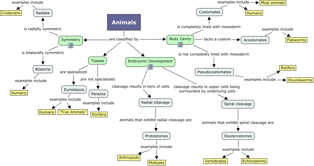 This Concept Map, created with IHMC CmapTools, has information related to: Animals, Body Cavity is not completely lined with mesoderm Pseudocoelomates, Tissues are not specialized Parazoa, Body Cavity is completely lined with mesoderm Coelomates, Symmetry is radially symmetric Radiata, Acoelomates examples include Flatworms, Body Cavity lacks a coelom Acoelomates, Coelomates examples include Most animals, Animals are classified by Body Cavity, Embryonic Development cleavage results in upper cells being surrounded by underlying cells Spiral cleavage, Parazoa examples include Porifera, Embryonic Development cleavage results in tiers of cells Radial cleavage, Eumetazoa examples include Humans, Pseudocoelomates examples include Roundworms, Animals are classified by Embryonic Development, Symmetry is bilaterally symmetric Bilateria, Animals are classified by Tissues, Animals are classified by Symmetry, Radiata examples include Cnidarians, Radial cleavage animals that exhibit radial cleavage are Protostomes, Eumetazoa examples include "True Animals"