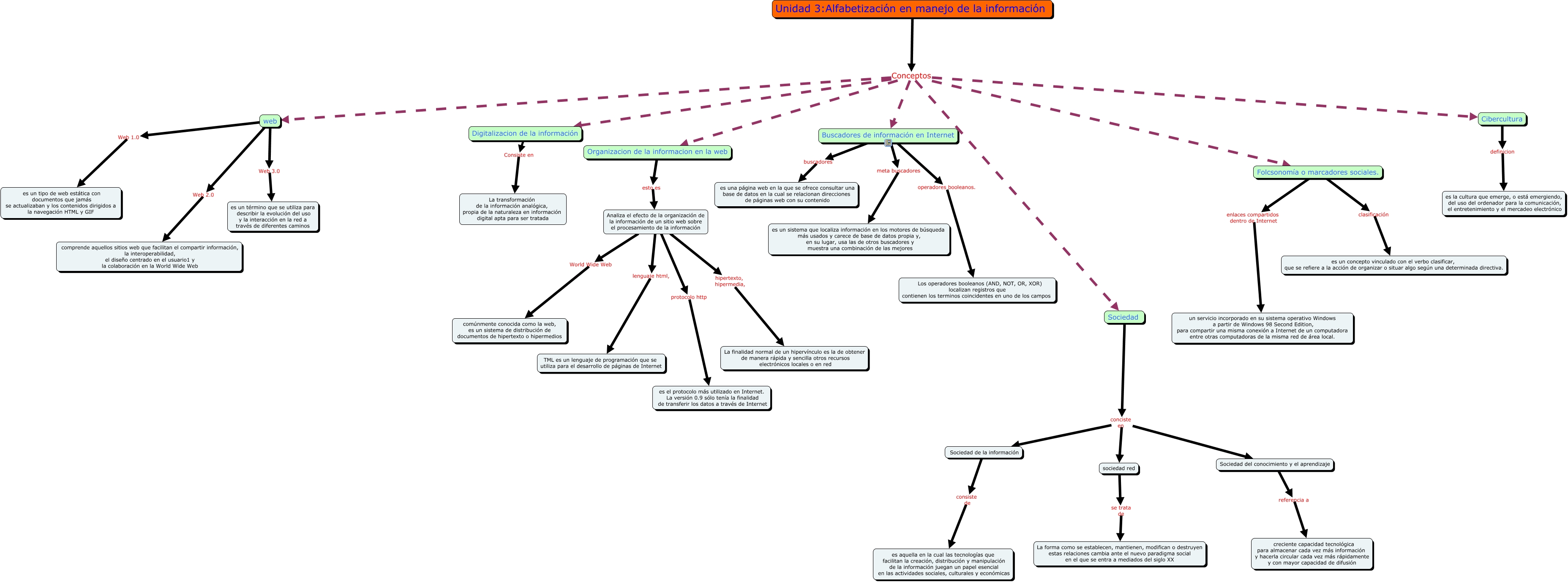 Este Cmap, tiene información relacionada con: lalolin, web Web 3.0 es un término que se utiliza para describir la evolución del uso y la interacción en la red a través de diferentes caminos, Cibercultura definicion es la cultura que emerge, o está emergiendo, del uso del ordenador para la comunicación, el entretenimiento y el mercadeo electrónico, Unidad 3:Alfabetización en manejo de la información Conceptos Digitalizacion de la información, Folcsonomía o marcadores sociales. enlaces compartidos dentro de Internet un servicio incorporado en su sistema operativo Windows a partir de Windows 98 Second Edition, para compartir una misma conexión a Internet de un computadora entre otras computadoras de la misma red de área local., Sociedad conciste en Sociedad de la información, Unidad 3:Alfabetización en manejo de la información Conceptos Sociedad, Buscadores de información en Internet buscadores es una página web en la que se ofrece consultar una base de datos en la cual se relacionan direcciones de páginas web con su contenido, Analiza el efecto de la organización de la información de un sitio web sobre el procesamiento de la información lenguaje html, TML es un lenguaje de programación que se utiliza para el desarrollo de páginas de Internet, Unidad 3:Alfabetización en manejo de la información Conceptos Cibercultura, web Web 2.0 comprende aquellos sitios web que facilitan el compartir información, la interoperabilidad, el diseño centrado en el usuario1 y la colaboración en la World Wide Web, Analiza el efecto de la organización de la información de un sitio web sobre el procesamiento de la información hipertexto, hipermedia, La finalidad normal de un hipervínculo es la de obtener de manera rápida y sencilla otros recursos electrónicos locales o en red, Unidad 3:Alfabetización en manejo de la información Conceptos Buscadores de información en Internet, Sociedad del conocimiento y el aprendizaje referencia a creciente capacidad tecnológica para almacenar cada vez más información y hacerla circular cada vez más rápidamente y con mayor capacidad de difusión, Sociedad conciste en sociedad red, Buscadores de información en Internet operadores booleanos. Los operadores booleanos (AND, NOT, OR, XOR) localizan registros que contienen los terminos coincidentes en uno de los campos, Sociedad de la información consiste de es aquella en la cual las tecnologías que facilitan la creación, distribución y manipulación de la información juegan un papel esencial en las actividades sociales, culturales y económicas, Folcsonomía o marcadores sociales. clasificación es un concepto vinculado con el verbo clasificar, que se refiere a la acción de organizar o situar algo según una determinada directiva., Unidad 3:Alfabetización en manejo de la información Conceptos Folcsonomía o marcadores sociales., Unidad 3:Alfabetización en manejo de la información Conceptos Organizacion de la informacion en la web, web Web 1.0 es un tipo de web estática con documentos que jamás se actualizaban y los contenidos dirigidos a la navegación HTML y GIF