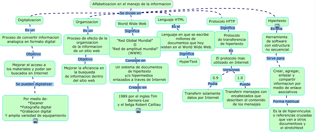 Este Cmap, tiene información relacionada con: Almendra, Karen, Fiorella, Digitalizacion Es un Proceso de convertir informacion analogica en formato digital, Lenguaje HTML Es el Lenguaje en que se escribe millones de documentos que hoy existen en el World Wide Web., Hipertexto Es una Herramienta de software con estructura no secuencial., Proceso de convertir informacion analogica en formato digital Objetivo Mejorar el acceso a los materiales y poder ser buscados en Internet, Alfabetizacion en el manejo de la informacion Se divide en Protocolo HTTP, Herramienta de software con estructura no secuencial. Sirve para Crear, agregar, enlazar y compartir informacion por medio de enlace asociativos, Proceso de efecto de la organizacion de la informacion de un sitio web Objetivo Mejorar la eficiencia en la busqueda de informacion dentro del sitio web, Un sistema de documentos de hipertexto y/o hipermedios enlazados a traves de Internet Creado en 1989 por el ingles Tim Berners-Lee y el belga Robert Cailliau, Alfabetizacion en el manejo de la informacion Se divide en Digitalizacion, World Wide Web Significa "Red Global Mundial" O "Red de amplitud mundial" (WWW), "Red Global Mundial" O "Red de amplitud mundial" (WWW) Consiste en Un sistema de documentos de hipertexto y/o hipermedios enlazados a traves de Internet, Protocolo HTTP Significa Protocolo de transferencia de hipertexto, El protocolo mas utilizado en Internet Versiones 1.0, Alfabetizacion en el manejo de la informacion Se divide en Hipertexto, Alfabetizacion en el manejo de la informacion Se divide en World Wide Web, Alfabetizacion en el manejo de la informacion Se divide en Lenguaje HTML, Protocolo de transferencia de hipertexto Es El protocolo mas utilizado en Internet, Mejorar el acceso a los materiales y poder ser buscados en Internet Se pueden digitalizar Por medio de: *Escaner *Fotografia digital *Grabacion digital Y amplia variedad de equipamiento, Lenguaje en que se escribe millones de documentos que hoy existen en el World Wide Web. Significa HyperText, El protocolo mas utilizado en Internet Versiones 0.9
