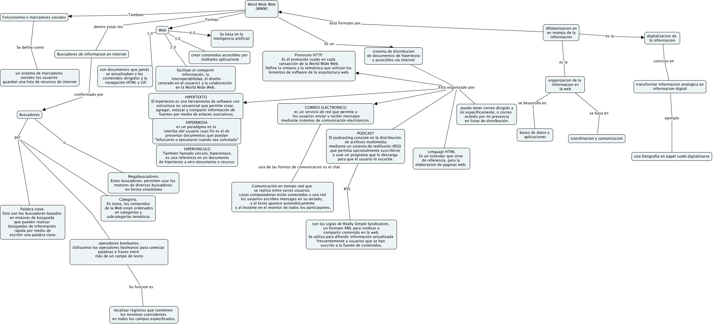 Este Cmap, tiene información relacionada con: MAPA 1 LINEDO, Word Wide Web (WWW) Tambien Folcsonomía o marcadores sociales, Buscadores o Megabuscadores. Estos buscadores, permiten usar los motores de diversos buscadores en forma simultánea, Web 3.0 crear contenidos accesibles por múltiples aplicacione, sistema de distribucion de documentos de hipertexto y accecibles via internet Esta organizado por: CORREO ELECTRONICO es un servicio de red que permite a los usuarios enviar y recibir mensajes mediante sistemas de comunicación electrónicos., Web 1.0 con documentos que jamás se actualizaban y los contenidos dirigidos a la navegación HTML y GIF, sistema de distribucion de documentos de hipertexto y accecibles via internet Esta organizado por: puedo tener correo dirigido a mí específicamente, o correo ecibido por mi presencia en listas de distribución ., organizacion de la informacion en la web se desarrolla en bases de datos y aplicaciones, Folcsonomía o marcadores sociales Se define como un sistema de marcadores sociales los usuarios guardan una lista de recursos de internet, Word Wide Web (WWW) dentro estan los Buscadores de informacion en internet, PODCAST El podcasting consiste en la distribución de archivos multimedia mediante un sistema de redifusión (RSS) que permita opcionalmente suscribirse y usar un programa que lo descarga para que el usuario lo escuche. RSS son las siglas de Really Simple Syndication, un formato XML para sindicar o compartir contenido en la web. Se utiliza para difundir información actualizada frecuentemente a usuarios que se han suscrito a la fuente de contenidos., CORREO ELECTRONICO es un servicio de red que permite a los usuarios enviar y recibir mensajes mediante sistemas de comunicación electrónicos. una de las formas de comunicacion es el chat Comunicación en tiempo real que se realiza entre varios usuarios cuyas computadoras están conectadas a una red los usuarios escriben mensajes en su teclado, y el texto aparece automáticamente y al instante en el monitor de todos los participantes., Alfabetizacion en en manejo de la informacion es la digitalizacion de la informacion, Alfabetizacion en en manejo de la informacion esta formado por Word Wide Web (WWW), Buscadores de informacion en internet conformado por Buscadores, sistema de distribucion de documentos de hipertexto y accecibles via internet Esta organizado por: Protocolo HTTP Es el protocolo usado en cada ransacción de la World Wide Web. Define la sintaxis y la semántica que utilizan los lementos de software de la arquitectura web., operadores booleanos. Utilizamos los operadores booleanos para conectar palabras o frases entre más de un campo de texto Su funcion es localizar registros que contienen los terminos coincidentes en todos los campos especificados., Word Wide Web (WWW) es un sistema de distribucion de documentos de hipertexto y accecibles via internet, sistema de distribucion de documentos de hipertexto y accecibles via internet Esta organizado por: Lenguaje HTML Es un estandar que sirve de referencia, para la elaboracion de paginas web., Word Wide Web (WWW) Formas Web, sistema de distribucion de documentos de hipertexto y accecibles via internet Esta organizado por: PODCAST El podcasting consiste en la distribución de archivos multimedia mediante un sistema de redifusión (RSS) que permita opcionalmente suscribirse y usar un programa que lo descarga para que el usuario lo escuche.