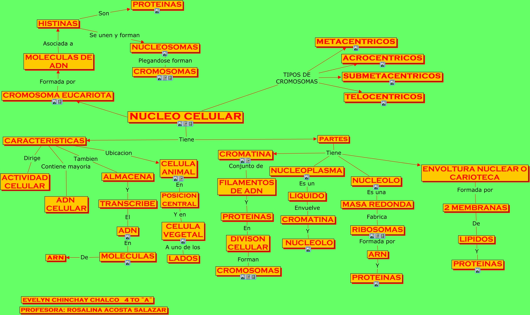Este Cmap, tiene información relacionada con: NUCLEO CELULAR, NUCLEO CELULAR Tiene partes, HISTINAS Se unen y forman NUCLEOSOMAS, ALMACENA Y TRANSCRIBE, ENVOLTURA NUCLEAR O CARIOTECA Formada por 2 MEMBRANAS, 2 MEMBRANAS De LIPIDOS, DIVISON CELULAR Forman CROMOSOMAS, CARACTERISTICAS Ubicacion CELULA ANIMAL, HISTINAS Son PROTEINAS, NUCLEO CELULAR TIPOS DE CROMOSOMAS METACENTRICOS, CARACTERISTICAS Tambien ALMACENA, NUCLEO CELULAR Tiene CARACTERISTICAS, CARACTERISTICAS Contiene mayoria ADN CELULAR, partes Tiene CROMATINA, NUCLEOLO Es una MASA REDONDA, NUCLEO CELULAR TIPOS DE CROMOSOMAS ACROCENTRICOS, partes Tiene NUCLEOPLASMA, CROMATINA Conjunto de FILAMENTOS DE ADN, FILAMENTOS DE ADN Y PROTEINAS, partes Tiene NUCLEOLO, CARACTERISTICAS Dirige ACTIVIDAD CELULAR