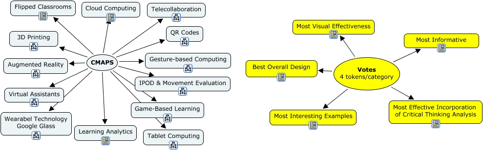 This Concept Map, created with IHMC CmapTools, has information related to: VIEW AND VOTE, CMAPS Virtual Assistants, CMAPS Flipped Classrooms, CMAPS IPOD & Movement Evaluation, CMAPS Telecollaboration, CMAPS Augmented Reality, CMAPS Gesture-based Computing, Votes 4 tokens/category Most Interesting Examples, CMAPS Tablet Computing, Votes 4 tokens/category Most Informative, CMAPS 3D Printing, Votes 4 tokens/category Most Effective Incorporation of Critical Thinking Analysis, CMAPS QR Codes, CMAPS Game-Based Learning, Votes 4 tokens/category Most Visual Effectiveness, CMAPS Cloud Computing, Votes 4 tokens/category Best Overall Design, CMAPS Learning Analytics, CMAPS Wearabel Technology Google Glass
