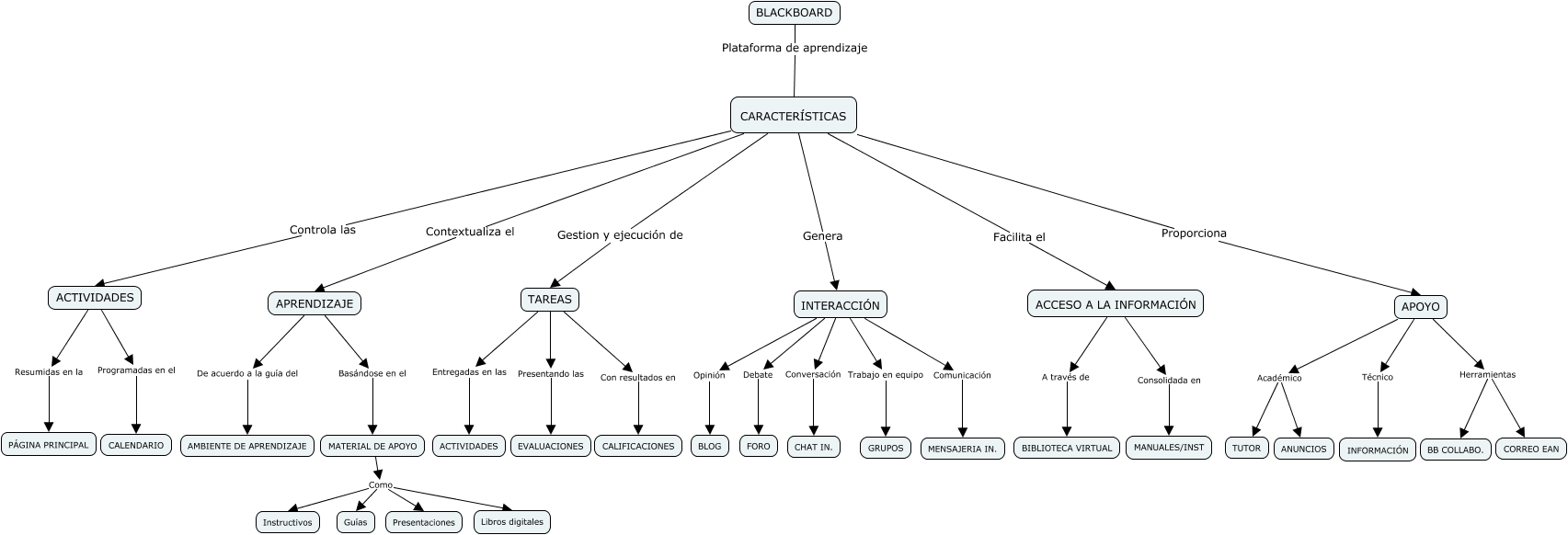 Este Cmap, tiene información relacionada con: Aula Virtual, APOYO Académico TUTOR, APOYO Académico ANUNCIOS, MATERIAL DE APOYO Como Instructivos, ACCESO A LA INFORMACIÓN A través de BIBLIOTECA VIRTUAL, INTERACCIÓN Conversación CHAT IN., TAREAS Entregadas en las ACTIVIDADES, APOYO Técnico INFORMACIÓN, APOYO Herramientas BB COLLABO., MATERIAL DE APOYO Como Libros digitales, APOYO Herramientas CORREO EAN, INTERACCIÓN Trabajo en equipo GRUPOS, MATERIAL DE APOYO Como Presentaciones, APRENDIZAJE Basándose en el MATERIAL DE APOYO, INTERACCIÓN Debate FORO, APRENDIZAJE De acuerdo a la guía del AMBIENTE DE APRENDIZAJE, CARACTERÍSTICAS Genera INTERACCIÓN, CARACTERÍSTICAS Gestion y ejecución de TAREAS, TAREAS Con resultados en CALIFICACIONES, ACTIVIDADES Resumidas en la PÁGINA PRINCIPAL, INTERACCIÓN Comunicación MENSAJERIA IN.