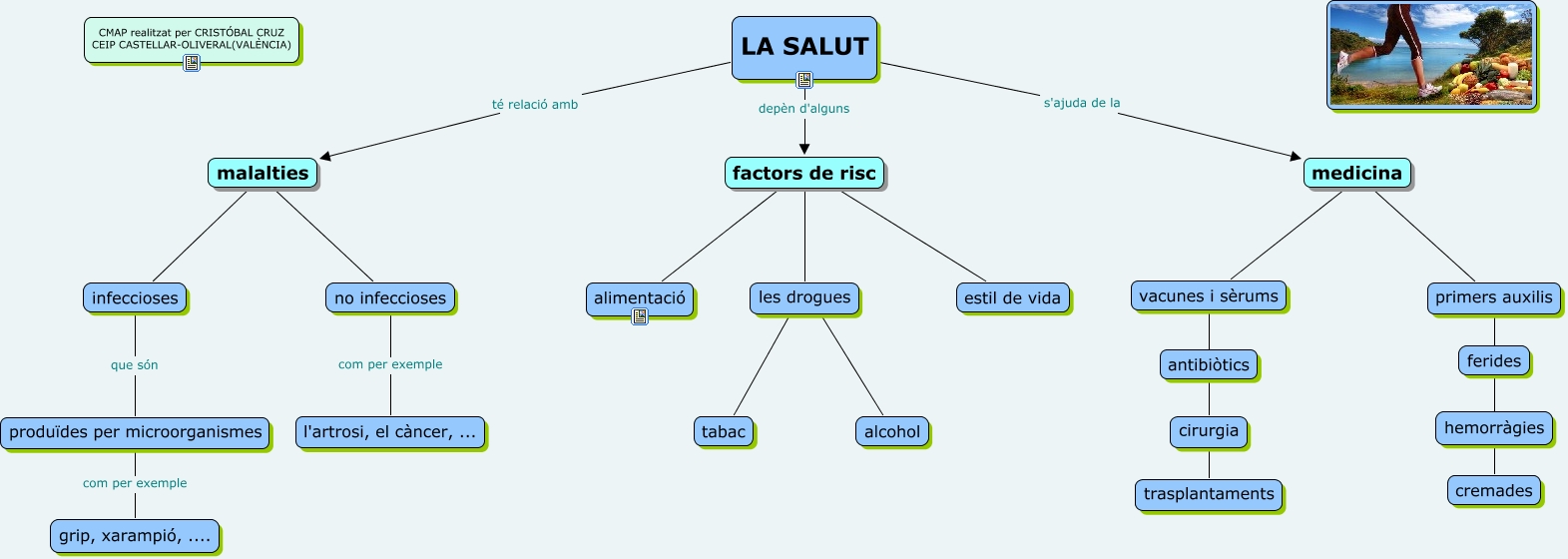 Este Cmap, tiene información relacionada con: LA SALUT, no infeccioses com per exemple l'artrosi, el càncer, ..., malalties són no infeccioses, vacunes i sèrums ???? cirurgia, LA SALUT depèn d'alguns factors de risc, LA SALUT s'ajuda de la medicina, produïdes per microorganismes com per exemple grip, xarampió, ...., les drogues ???? tabac, factors de risc estil de vida, les drogues ???? alcohol, factors de risc les drogues, medicina ???? primers auxilis, cirurgia ???? trasplantaments, malalties són infeccioses, LA SALUT té relació amb malalties, primers auxilis ???? cremades, medicina ???? vacunes i sèrums, infeccioses que són produïdes per microorganismes, factors de risc alimentació