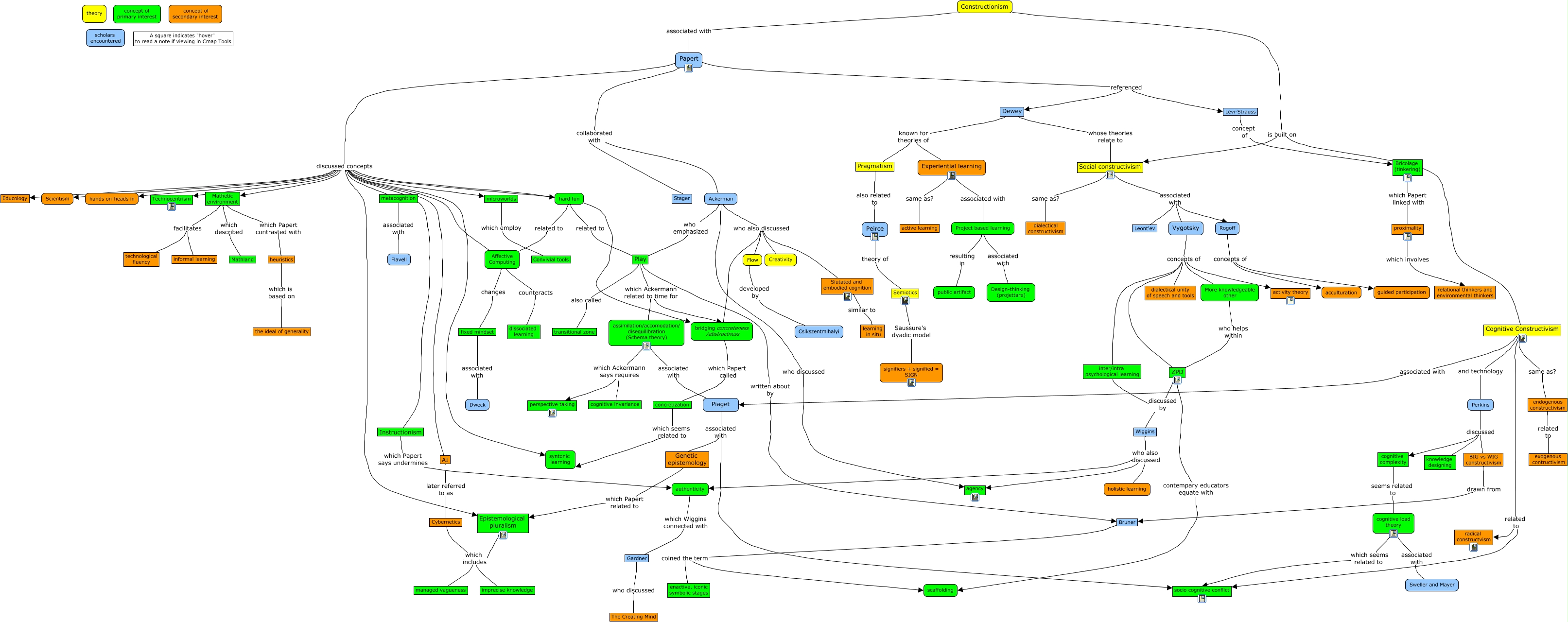 This Concept Map, created with IHMC CmapTools, has information related to: Constructionism 4.0, Piaget associated with socio cognitive conflict, ZPD discussed by Wiggins, metacognition associated with Flavell, Perkins discussed cognitive complexity, Instructionism which Papert says undermines authenticity, Play which Ackermann related to time for bridging concreteness /abstractness, Mathetic environment facilitates technological fluency, Cognitive Constructivism related to socio cognitive conflict, Genetic epistemology which Papert related to Epistemological pluralism, Papert discussed concepts hard fun, Papert discussed concepts Educology, Dewey whose theories relate to Social constructivism, Ackerman who also discussed Flow, Wiggins who also discussed holistic learning, Epistemological pluralism which includes imprecise knowledge, Siutated and embodied cognition similar to learning in situ, Wiggins who also discussed authenticity, Epistemological pluralism which includes managed vagueness, Papert discussed concepts bridging concreteness /abstractness, Papert discussed concepts Instructionism