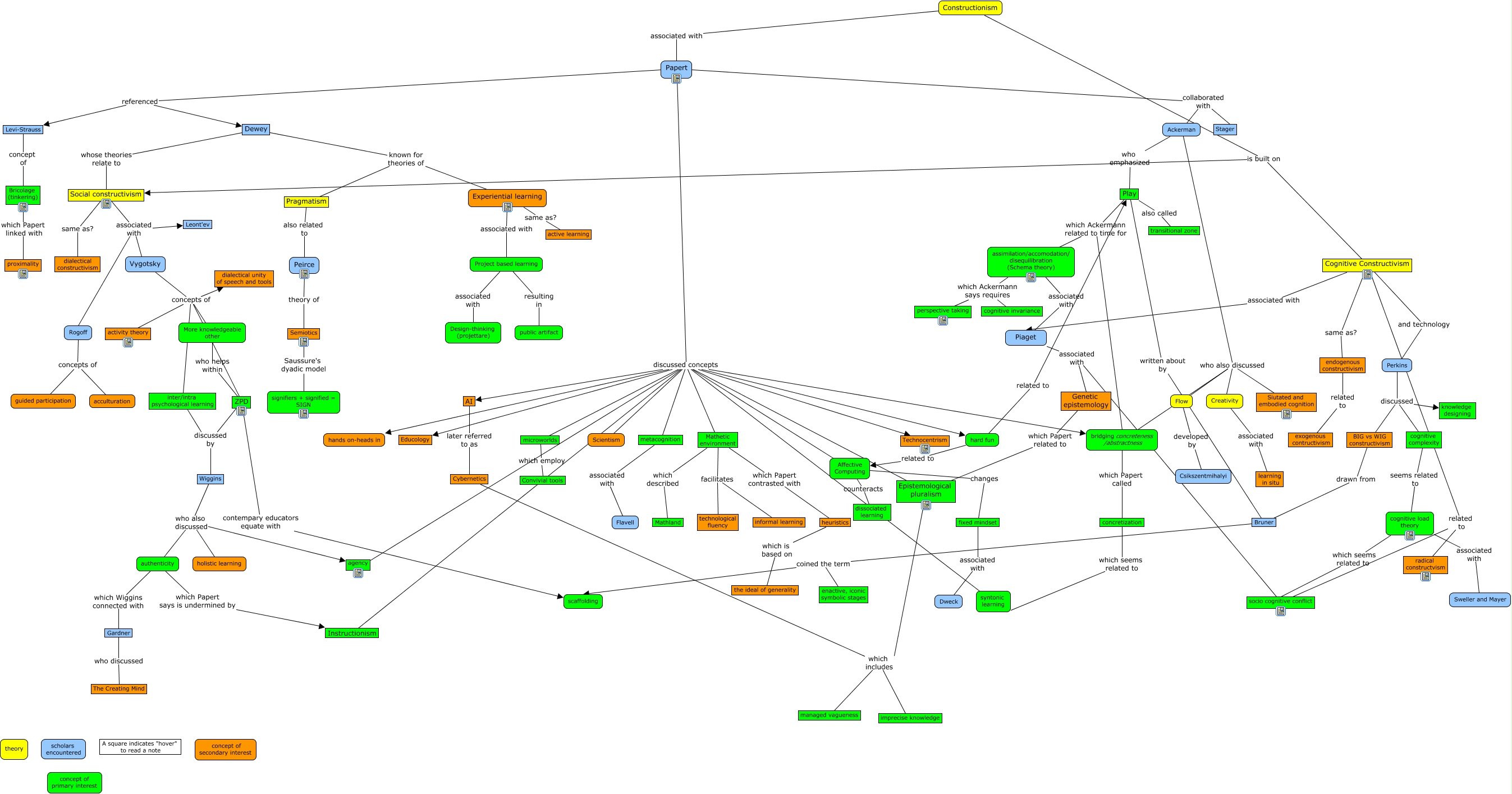 This Concept Map, created with IHMC CmapTools, has information related to: Constructionism 3.0, Piaget associated with socio cognitive conflict, ZPD discussed by Wiggins, metacognition associated with Flavell, Perkins discussed cognitive complexity, Mathetic environment facilitates technological fluency, Cognitive Constructivism related to socio cognitive conflict, Creativity associated with learning in situ, Genetic epistemology which Papert related to Epistemological pluralism, Papert discussed concepts hard fun, Papert discussed concepts Educology, Dewey whose theories relate to Social constructivism, Ackerman who also discussed Flow, Wiggins who also discussed holistic learning, Epistemological pluralism which includes imprecise knowledge, Wiggins who also discussed authenticity, Epistemological pluralism which includes managed vagueness, Papert discussed concepts bridging concreteness /abstractness, Papert discussed concepts Instructionism, Dewey known for theories of Experiential learning, Experiential learning associated with Project based learning