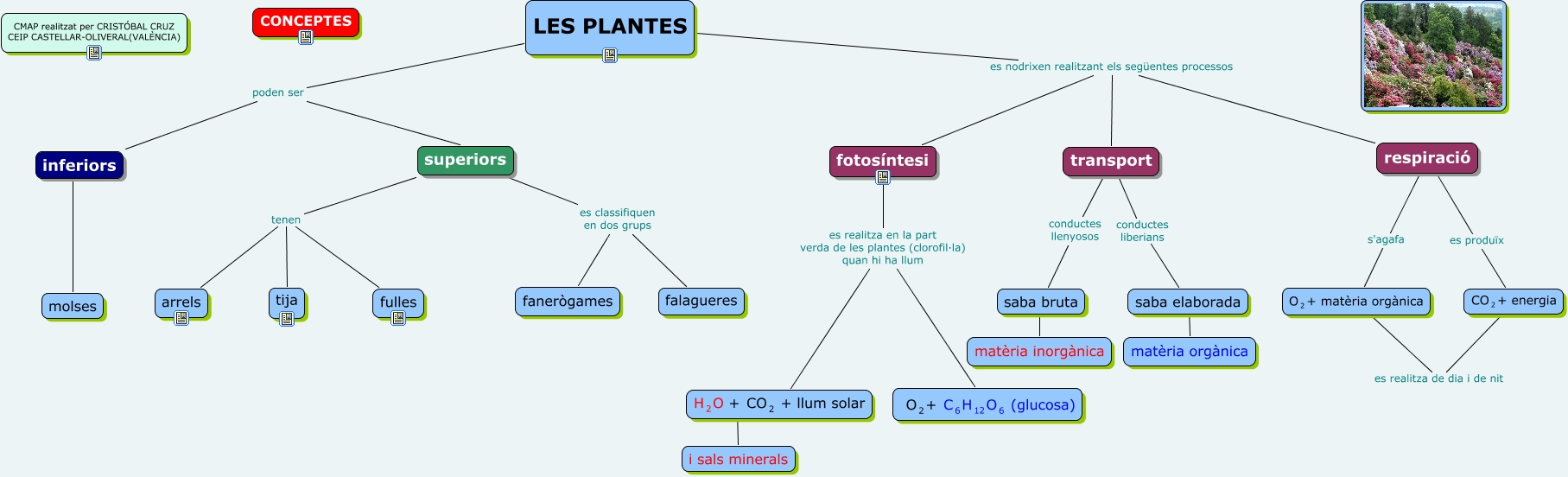 Este Cmap, tiene información relacionada con: LES PLANTES, <math xmlns="http://www.w3.org/1998/Math/MathML"> <mrow> <mmultiscripts> <mtext> O </mtext> <mtext> 2 </mtext> <none/> </mmultiscripts> <mtext> + matèria orgànica </mtext> </mrow> </math> s'agafa respiració, saba elaborada conductes liberians transport, inferiors són molses, transport es nodrixen realitzant els següentes processos fotosíntesi, superiors tenen tija, LES PLANTES es nodrixen realitzant els següentes processos fotosíntesi, superiors es classifiquen en dos grups fanerògames, <math xmlns="http://www.w3.org/1998/Math/MathML"> <mrow> <mmultiscripts> <mtext> CO </mtext> <mtext> 2 </mtext> <none/> </mmultiscripts> <mtext> + energia </mtext> </mrow> </math> es produïx respiració, es realitza de dia i de nit <math xmlns="http://www.w3.org/1998/Math/MathML"> <mrow> <mmultiscripts> <mtext> O </mtext> <mtext> 2 </mtext> <none/> </mmultiscripts> <mtext> + matèria orgànica </mtext> </mrow> </math>, LES PLANTES poden ser superiors, matèria inorgànica ???? saba bruta, respiració es nodrixen realitzant els següentes processos fotosíntesi, fotosíntesi es realitza en la part verda de les plantes (clorofil·la) quan hi ha llum <math xmlns="http://www.w3.org/1998/Math/MathML"> <mrow> <mmultiscripts> <mtext> H </mtext> <mtext> 2 </mtext> <none/> </mmultiscripts> <mtext> O + </mtext> <mmultiscripts> <mtext> CO </mtext> <mtext> 2 </mtext> <none/> </mmultiscripts> <mtext> + llum solar </mtext> </mrow> </math>, es realitza de dia i de nit <math xmlns="http://www.w3.org/1998/Math/MathML"> <mrow> <mmultiscripts> <mtext> CO </mtext> <mtext> 2 </mtext> <none/> </mmultiscripts> <mtext> + energia </mtext> </mrow> </math>, <math xmlns="http://www.w3.org/1998/Math/MathML"> <mrow> <mmultiscripts> <mtext> H </mtext> <mtext> 2 </mtext> <none/> </mmultiscripts> <mtext> O + </mtext> <mmultiscripts> <mtext> CO </mtext> <mtext> 2 </mtext> <none/> </mmultiscripts> <mtext> + llum solar </mtext> </mrow> </math> ???? i sals minerals, superiors tenen arrels, <math xmlns="http://www.w3.org/1998/Math/MathML"> <mrow> <mtext> </mtext> <mmultiscripts> <mtext> O </mtext> <mtext> 2 </mtext> <none/> </mmultiscripts> <mtext> + </mtext> <mmultiscripts> <mtext> C </mtext> <mtext> 6 </mtext> <none/> </mmultiscripts> <mmultiscripts> <mtext> H </mtext> <mtext> 12 </mtext> <none/> </mmultiscripts> <mmultiscripts> <mtext> O </mtext> <mtext> 6 </mtext> <none/> </mmultiscripts> <mtext> (glucosa) </mtext> </mrow> </math> es realitza en la part verda de les plantes (clorofil·la) quan hi ha llum <math xmlns="http://www.w3.org/1998/Math/MathML"> <mrow> <mmultiscripts> <mtext> H </mtext> <mtext> 2 </mtext> <none/> </mmultiscripts> <mtext> O + </mtext> <mmultiscripts> <mtext> CO </mtext> <mtext> 2 </mtext> <none/> </mmultiscripts> <mtext> + llum solar </mtext> </mrow> </math>, superiors es classifiquen en dos grups falagueres, superiors tenen fulles, matèria orgànica ???? saba elaborada