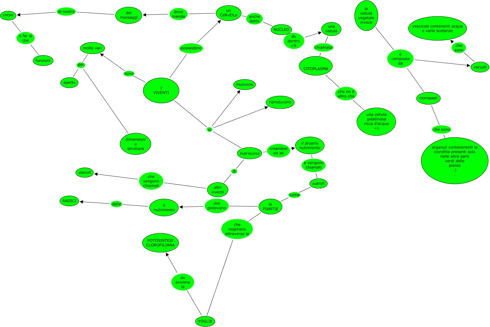 Questa Cmap, creata con IHMC CmapTools, contiene informazioni relative a: I VIVENTI, FOGLIE dv avviene la FOTOSINTESI CLOROFILIANA, I VIVENTI possiedeno un CeRvElLo, cloropasti che sono organuli contenenenti la clorofilla presenti solo nelle altre parti verdi delle piante :) ., un CeRvElLo dove manda dei messaggi, la cellula vegetale invece è composta da vacuoli, NUCLEO dv dentro c'è una cellula, le PIANTIE che prelevano il nutrimento, un CeRvElLo anche detto NUCLEO, I VIVENTI si nutriscono, altri viventi che vengono chiamati eterofi, corpo x far si che funzioni, il proprio nutrimento e vengono chiamati autrofi, vacuoli che sono vescicole contenenti acqua e varie sostanze, molto vari per apetto, le PIANTIE che respirano attraverso le FOGLIE, una cellula chiamata CITOPLASMA, I VIVENTI si muovono, nutriscono di altri viventi, nutriscono creandosi da sè il proprio nutrimento, I VIVENTI sono molto vari