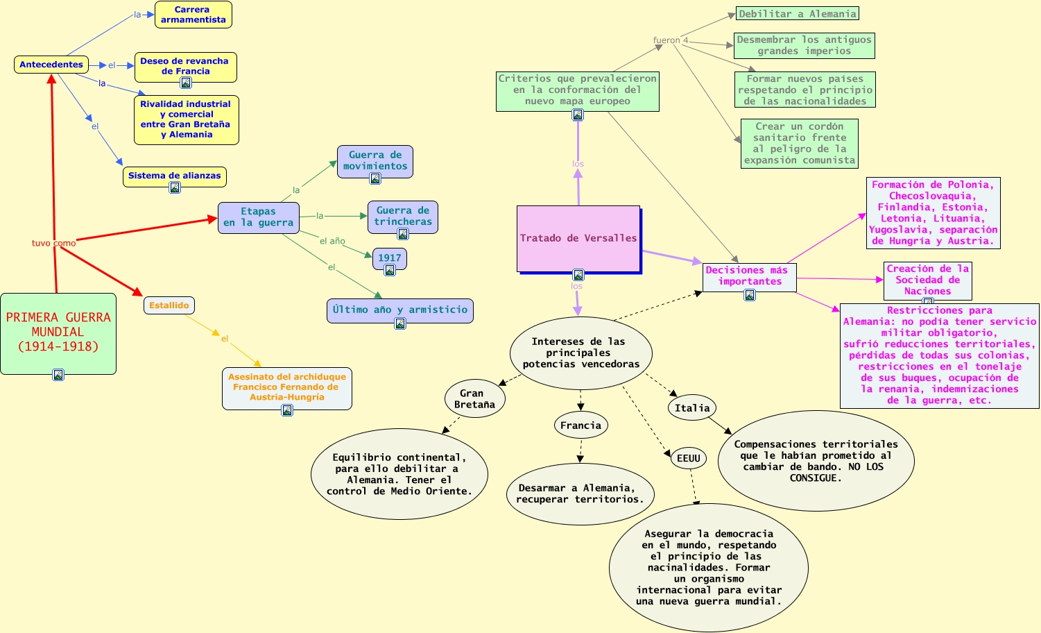 Este Cmap, tiene información relacionada con: Primera Guerra Mundial -cuadro, Tratado de Versalles los Intereses de las principales potencias vencedoras, Decisiones más importantes ???? Formación de Polonia, Checoslovaquia, Finlandia, Estonia, Letonia, Lituania, Yugoslavia, separación de Hungría y Austria., Intereses de las principales potencias vencedoras ???? Decisiones más importantes, Antecedentes la Carrera armamentista, Antecedentes la Rivalidad industrial y comercial entre Gran Bretaña y Alemania, Etapas en la guerra el año 1917, Antecedentes el Deseo de revancha de Francia, Criterios que prevalecieron en la conformación del nuevo mapa europeo fueron 4 Crear un cordón sanitario frente al peligro de la expansión comunista, Estallido el Asesinato del archiduque Francisco Fernando de Austria-Hungría, Italia ???? Compensaciones territoriales que le habían prometido al cambiar de bando. NO LOS CONSIGUE., Tratado de Versalles ???? Decisiones más importantes, Gran Bretaña ???? Equilibrio continental, para ello debilitar a Alemania. Tener el control de Medio Oriente., PRIMERA GUERRA MUNDIAL (1914-1918) tuvo como Etapas en la guerra, Criterios que prevalecieron en la conformación del nuevo mapa europeo fueron 4 Desmembrar los antiguos grandes imperios, Criterios que prevalecieron en la conformación del nuevo mapa europeo ???? Decisiones más importantes, Intereses de las principales potencias vencedoras ???? Italia, EEUU ???? Asegurar la democracia en el mundo, respetando el principio de las nacinalidades. Formar un organismo internacional para evitar una nueva guerra mundial., Intereses de las principales potencias vencedoras ???? Gran Bretaña, Tratado de Versalles los Criterios que prevalecieron en la conformación del nuevo mapa europeo, Criterios que prevalecieron en la conformación del nuevo mapa europeo fueron 4 Debilitar a Alemania