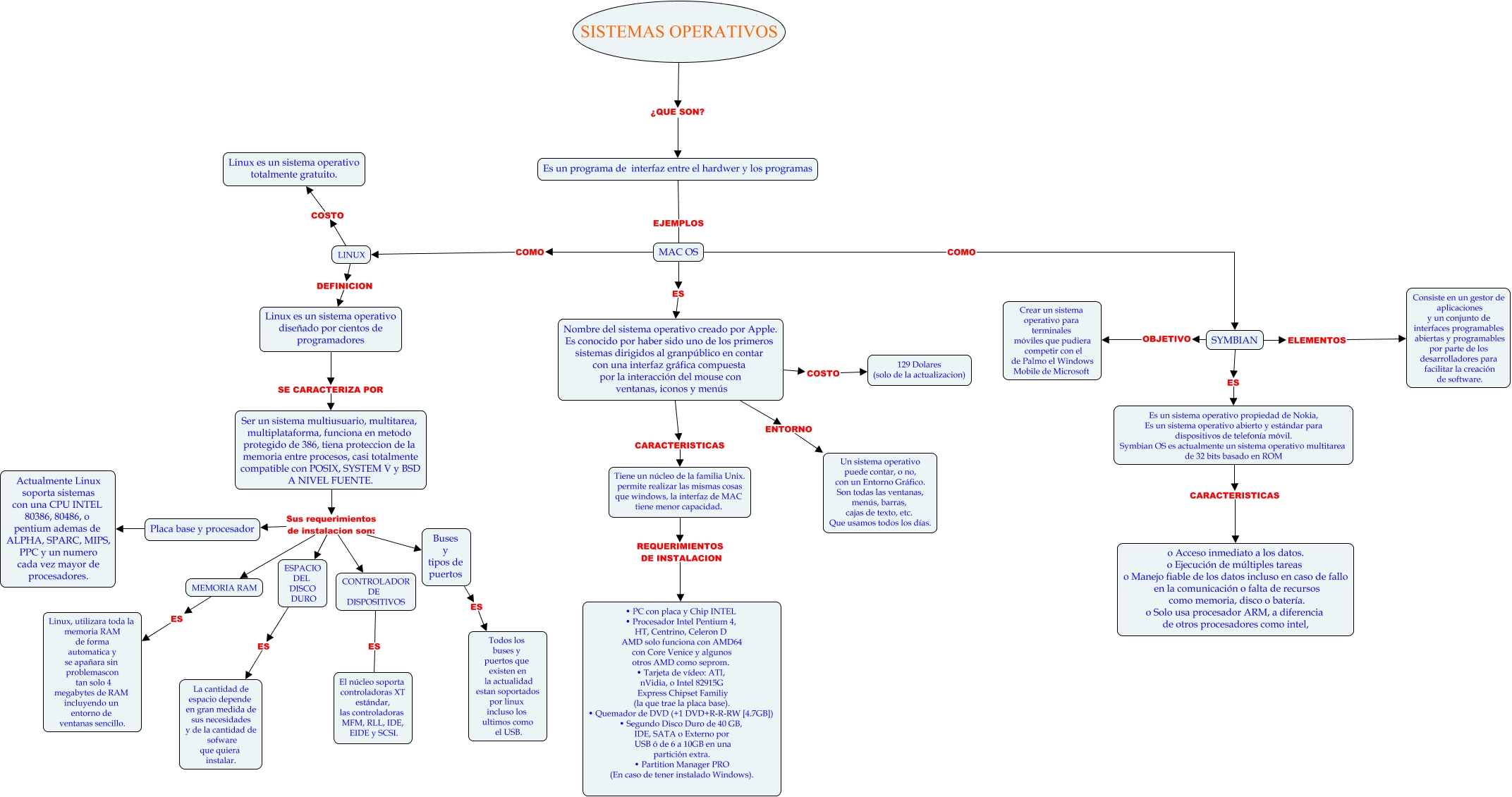 Este Cmap, tiene información relacionada con: sistemas operativos, ESPACIO DEL DISCO DURO ES La cantidad de espacio depende en gran medida de sus necesidades y de la cantidad de sofware que quiera instalar., MAC OS ES Nombre del sistema operativo creado por Apple. Es conocido por haber sido uno de los primeros sistemas dirigidos al granpúblico en contar con una interfaz gráfica compuesta por la interacción del mouse con ventanas, iconos y menús, Nombre del sistema operativo creado por Apple. Es conocido por haber sido uno de los primeros sistemas dirigidos al granpúblico en contar con una interfaz gráfica compuesta por la interacción del mouse con ventanas, iconos y menús CARACTERISTICAS Tiene un núcleo de la familia Unix. permite realizar las mismas cosas que windows, la interfaz de MAC tiene menor capacidad., Ser un sistema multiusuario, multitarea, multiplataforma, funciona en metodo protegido de 386, tiena proteccion de la memoria entre procesos, casi totalmente compatible con POSIX, SYSTEM V y BSD A NIVEL FUENTE. Sus requerimientos de instalacion son: Buses y tipos de puertos, Es un programa de interfaz entre el hardwer y los programas EJEMPLOS MAC OS, Linux es un sistema operativo diseñado por cientos de programadores SE CARACTERIZA POR Ser un sistema multiusuario, multitarea, multiplataforma, funciona en metodo protegido de 386, tiena proteccion de la memoria entre procesos, casi totalmente compatible con POSIX, SYSTEM V y BSD A NIVEL FUENTE., Ser un sistema multiusuario, multitarea, multiplataforma, funciona en metodo protegido de 386, tiena proteccion de la memoria entre procesos, casi totalmente compatible con POSIX, SYSTEM V y BSD A NIVEL FUENTE. Sus requerimientos de instalacion son: MEMORIA RAM, Nombre del sistema operativo creado por Apple. Es conocido por haber sido uno de los primeros sistemas dirigidos al granpúblico en contar con una interfaz gráfica compuesta por la interacción del mouse con ventanas, iconos y menús ENTORNO Un sistema operativo puede contar, o no, con un Entorno Gráfico. Son todas las ventanas, menús, barras, cajas de texto, etc. Que usamos todos los días., Ser un sistema multiusuario, multitarea, multiplataforma, funciona en metodo protegido de 386, tiena proteccion de la memoria entre procesos, casi totalmente compatible con POSIX, SYSTEM V y BSD A NIVEL FUENTE. Sus requerimientos de instalacion son: ESPACIO DEL DISCO DURO, LINUX COSTO Linux es un sistema operativo totalmente gratuito., MAC OS COMO LINUX, SISTEMAS OPERATIVOS ¿QUE SON? Es un programa de interfaz entre el hardwer y los programas, Ser un sistema multiusuario, multitarea, multiplataforma, funciona en metodo protegido de 386, tiena proteccion de la memoria entre procesos, casi totalmente compatible con POSIX, SYSTEM V y BSD A NIVEL FUENTE. Sus requerimientos de instalacion son: Placa base y procesador, MEMORIA RAM ES Linux, utilizara toda la memoria RAM de forma automatica y se apañara sin problemascon tan solo 4 megabytes de RAM incluyendo un entorno de ventanas sencillo., SYMBIAN ELEMENTOS Consiste en un gestor de aplicaciones y un conjunto de interfaces programables abiertas y programables por parte de los desarrolladores para facilitar la creación de software., Es un sistema operativo propiedad de Nokia, Es un sistema operativo abierto y estándar para dispositivos de telefonía móvil. Symbian OS es actualmente un sistema operativo multitarea de 32 bits basado en ROM CARACTERISTICAS o Acceso inmediato a los datos. o Ejecución de múltiples tareas o Manejo fiable de los datos incluso en caso de fallo en la comunicación o falta de recursos como memoria, disco o batería. o Solo usa procesador ARM, a diferencia de otros procesadores como intel,, Buses y tipos de puertos ES Todos los buses y puertos que existen en la actualidad estan soportados por linux incluso los ultimos como el USB., SYMBIAN ES Es un sistema operativo propiedad de Nokia, Es un sistema operativo abierto y estándar para dispositivos de telefonía móvil. Symbian OS es actualmente un sistema operativo multitarea de 32 bits basado en ROM, SYMBIAN OBJETIVO Crear un sistema operativo para terminales móviles que pudiera competir con el de Palmo el Windows Mobile de Microsoft, Nombre del sistema operativo creado por Apple. Es conocido por haber sido uno de los primeros sistemas dirigidos al granpúblico en contar con una interfaz gráfica compuesta por la interacción del mouse con ventanas, iconos y menús COSTO 129 Dolares (solo de la actualizacion)