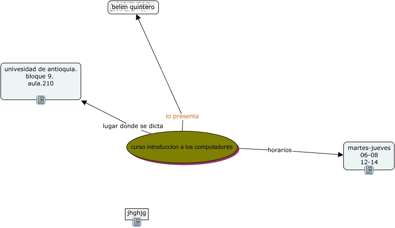 Este Cmap, tiene información relacionada con: clase, curso introduccion a los computadores horarios martes-jueves 06-08 12-14, curso introduccion a los computadores lugar donde se dicta univesidad de antioquia. bloque 9. aula.210, curso introduccion a los computadores lo presenta belen quintero
