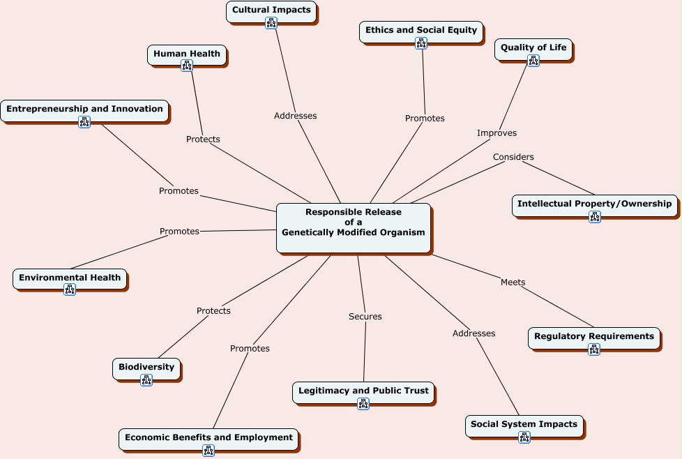 This Concept Map, created with IHMC CmapTools, has information related to: Main Map, Responsible Release of a Genetically Modified Organism Considers Intellectual Property/Ownership, Responsible Release of a Genetically Modified Organism Addresses Social System Impacts, Responsible Release of a Genetically Modified Organism Protects Biodiversity, Responsible Release of a Genetically Modified Organism Improves Quality of Life, Responsible Release of a Genetically Modified Organism Protects Human Health, Responsible Release of a Genetically Modified Organism Secures Legitimacy and Public Trust, Responsible Release of a Genetically Modified Organism Promotes Entrepreneurship and Innovation, Responsible Release of a Genetically Modified Organism Promotes Economic Benefits and Employment, Responsible Release of a Genetically Modified Organism Promotes Environmental Health, Responsible Release of a Genetically Modified Organism Promotes Ethics and Social Equity, Responsible Release of a Genetically Modified Organism Addresses Cultural Impacts, Responsible Release of a Genetically Modified Organism Meets Regulatory Requirements