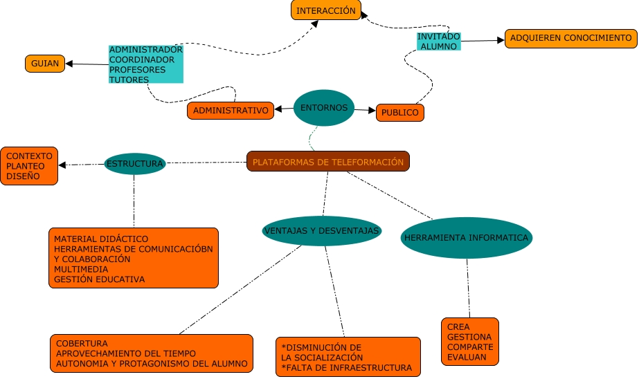 Este Cmap, tiene información relacionada con: EDUCACIÓN EN LINEA, PLATAFORMAS DE TELEFORMACIÓN ENTORNOS ADMINISTRATIVO, ADMINISTRATIVO ADMINISTRADOR COORDINADOR PROFESORES TUTORES INTERACCIÓN, PLATAFORMAS DE TELEFORMACIÓN ESTRUCTURA CONTEXTO PLANTEO DISEÑO, PLATAFORMAS DE TELEFORMACIÓN ESTRUCTURA MATERIAL DIDÁCTICO HERRAMIENTAS DE COMUNICACIÓBN Y COLABORACIÓN MULTIMEDIA GESTIÓN EDUCATIVA, PLATAFORMAS DE TELEFORMACIÓN HERRAMIENTA INFORMATICA CREA GESTIONA COMPARTE EVALUAN, PUBLICO INVITADO ALUMNO INTERACCIÓN, PLATAFORMAS DE TELEFORMACIÓN ENTORNOS PUBLICO, PUBLICO INVITADO ALUMNO ADQUIEREN CONOCIMIENTO, ADMINISTRATIVO ADMINISTRADOR COORDINADOR PROFESORES TUTORES GUIAN, PLATAFORMAS DE TELEFORMACIÓN VENTAJAS Y DESVENTAJAS *DISMINUCIÓN DE LA SOCIALIZACIÓN *FALTA DE INFRAESTRUCTURA, PLATAFORMAS DE TELEFORMACIÓN VENTAJAS Y DESVENTAJAS COBERTURA APROVECHAMIENTO DEL TIEMPO AUTONOMIA Y PROTAGONISMO DEL ALUMNO