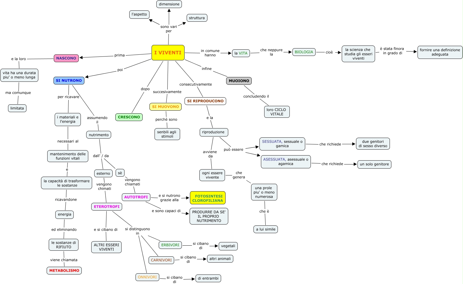 Questa Cmap, creata con IHMC CmapTools, contiene informazioni relative a: I VIVENTI ALESSIA ROVOLETTO 2°C, nutrimento dall' / da esterno, I VIVENTI poi SI NUTRONO, NASCONO e la loro vita ha una durata piu' o meno lunga, ETEROTROFI si distinguono in ERBIVORI, una prole piu' o meno numerosa che è a lui simile, sè vengono chiamati AUTOTROFI, ETEROTROFI e si cibano di ALTRI ESSERI VIVENTI, la VITA che neppure la BIOLOGIA, SI RIPRODUCONO e la riproduzione, ERBIVORI si cibano di vegetali, i materiali e l'energia necessari al mantenimento delle funzioni vitali, la scienza che studia gli esseri viventi è stata finora in grado di fornire una definizione adeguata, ASESSUATA, asessuale o agamica che richiede un solo genitore, I VIVENTI sono vari per dimensione, energia ed eliminando le sostanze di RIFIUTO, ETEROTROFI si distinguono in CARNIVORI, SI MUOVONO perchè sono senbili agli stimoli, I VIVENTI consecutivamente SI RIPRODUCONO, SI NUTRONO per ricavare i materiali e l'energia, I VIVENTI infine MUOIONO