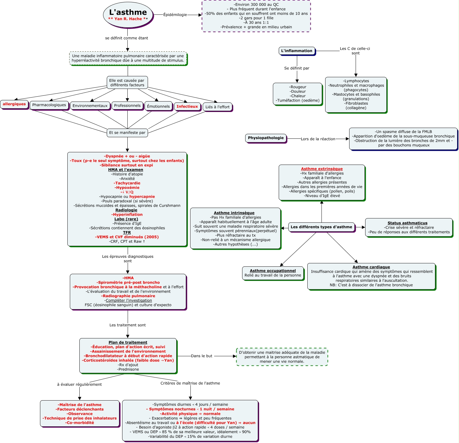 This Concept Map, created with IHMC CmapTools, has information related to: Asthme2, Elle est causée par différents facteurs Liés à l'effort, Les différents types d'asthme Asthme cardiaque Insuffisance cardique qui amène des symptômes qui ressemblent à l'asthme avec une dyspnée et des bruits respiratoires similaires à l'auscultation. NB: C'est à dissocier de l'asthme bronchique, Infectieux Et se manifeste par, Les différents types d'asthme Asthme occupationnel Relié au travail de la personne, Elle est causée par différents facteurs Environnementaux, Elle est causée par différents facteurs Émotionnels, L'asthme ** Yan R. Hache ** se définit comme étant Une maladie inflammatoire pulmonaire caractérisée par une hyperréactivité bronchique dûe à une multitude de stimulus., Plan de traitement -Éducation, plan d'action écrit, suivi -Assainissement de l'environnement -Bronchodilatateur à début d'action rapide -Corticostéroïdes inhalés (faible dose →Yan) -Rx d'ajout -Prednisone Dans le but D'obtenir une maitrise adéquate de la maladie permettant à la personne astmatique de mener une vie normale., Plan de traitement -Éducation, plan d'action écrit, suivi -Assainissement de l'environnement -Bronchodilatateur à début d'action rapide -Corticostéroïdes inhalés (faible dose →Yan) -Rx d'ajout -Prednisone à évaluer régulièrement -Maîtrise de l'asthme -Facteurs déclenchants -Observance -Technique de prise des inhalateurs -Co-morbidité, Et se manifeste par -Dyspnée + ou - aigüe -Toux (p-e le seul symptôme, surtout chez les enfants) -Sibilance surtout en expi HMA et l'examen -Histoire d'atopie -Anxiété -Tachycardie -Hypoxémie -↓ V/Q -Hypocapnie ou hypercapnie -Pouls paradoxal (si sévère) -Sécrétions mucoïdes et épaisses, spirales de Curshmann Radiologie -Hyperinflation Labo (rare) -Présence d'IgE -Sécrétions contiennent des éosinophiles TFR -VEMS et CVF diminués (2005) -CRF, CPT et Raw ↑, Les différents types d'asthme Asthme extrinsèque -Hx familiale d'allergies -Apparaît à l'enfance -Autres allergies présentes -Allergies dans les premières années de vie -Allergies spécifiques (pollen, poils) -Niveau d'IgE élevé, Elle est causée par différents facteurs Pharmacologiques, Elle est causée par différents facteurs Professionnels, L'inflammation Les C de celle-ci sont -Lymphocytes -Neutrophiles et macrophages (phagocytes) -Mastocytes et basophiles (granulations) -Fibroblastes (collagène), Liés à l'effort Et se manifeste par, Professionnels Et se manifeste par, allergiques Et se manifeste par, Les différents types d'asthme Status asthmaticus -Crise sévère et réfractaire -Peu de réponses aux différents traitements, Plan de traitement -Éducation, plan d'action écrit, suivi -Assainissement de l'environnement -Bronchodilatateur à début d'action rapide -Corticostéroïdes inhalés (faible dose →Yan) -Rx d'ajout -Prednisone Critères de maîtrise de l'asthme -Symptômes diurnes ≺ 4 jours / semaine - Symptômes nocturnes ≺ 1 nuit / semaine -Activité physique ⇒ normale - Exacerbations ⇒ légères et peu fréquentes -Absentéisme au travail ou à l'école (difficulté pour Yan) ⇒ aucun - Besoin d'agoniste β2 à action rapide ≺ 4 doses / semaine - VEMS ou DEP ≻ 85 % de sa meilleure valeur, idéalement ≻ 90% -Variabilité du DEP ≺ 15% de variation diurne, Elle est causée par différents facteurs allergiques