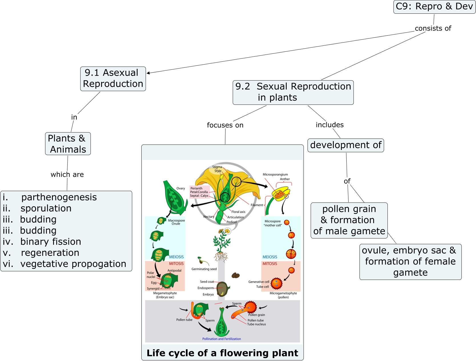 This Concept Map, created with IHMC CmapTools, has information related to: Overview of c9, 9.2 Sexual Reproduction in plants focuses on Life cycle of a flowering plant, 9.2 Sexual Reproduction in plants includes development of, Plants & Animals which are i. parthenogenesis ii. sporulation iii. budding iii. budding iv. binary fission v. regeneration vi. vegetative propogation, development of of ovule, embryo sac & formation of female gamete, development of of pollen grain & formation of male gamete, C9: Repro & Dev consists of 9.1 Asexual Reproduction, 9.1 Asexual Reproduction in Plants & Animals, C9: Repro & Dev consists of 9.2 Sexual Reproduction in plants