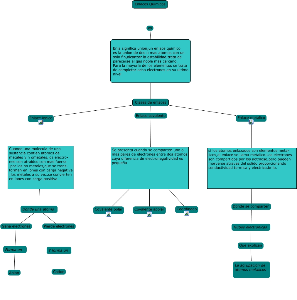 Este Cmap, tiene información relacionada con: Enlaces Quimicos, Forma un Anion, Se presenta cuando se comparten uno o mas pares de electrones entre dos atomos cuya diferencia de electronegatividad es pequeña Coordinado ????, Clases de enlaces Enlace metalico si los atomos enlazados son elementos meta- licos,el enlace se llama metalico.Los electrones son compartidos por los aotmoso,pero pueden morverse atraves del solido proporcionando conductividad termica y electrica,brilo., Cuando una molecula de una sustancia contien atomos de metales y n ometales,los electro- nes son atraidos con mas fuerza por los no metales,que se trans- forman en iones con carga negativa ;los metales a su vez,se convierten en iones con carga positiva ???? Donde una atomo, Y forma un Cation ????, Donde una atomo Gana electrones Forma un, Nubes electronicas Que explican La agrupacion de atomos metalicos, si los atomos enlazados son elementos meta- licos,el enlace se llama metalico.Los electrones son compartidos por los aotmoso,pero pueden morverse atraves del solido proporcionando conductividad termica y electrica,brilo. Donde se comparten Nubes electronicas, Se presenta cuando se comparten uno o mas pares de electrones entre dos atomos cuya diferencia de electronegatividad es pequeña Covalente apolar ????, Enlaces Quimicos es Enla significa union,un enlace quimico es la union de dos o mas atomos con un solo fin,alcanzar la estabilidad,trata de parecerse al gas noble mas cercano. Para la mayoria de los elementos se trata de completar ocho electrones en su ultimo nivel, Clases de enlaces Enlace covalente Se presenta cuando se comparten uno o mas pares de electrones entre dos atomos cuya diferencia de electronegatividad es pequeña, Clases de enlaces ???? Enla significa union,un enlace quimico es la union de dos o mas atomos con un solo fin,alcanzar la estabilidad,trata de parecerse al gas noble mas cercano. Para la mayoria de los elementos se trata de completar ocho electrones en su ultimo nivel, Donde una atomo Pierde electrones Y forma un, Se presenta cuando se comparten uno o mas pares de electrones entre dos atomos cuya diferencia de electronegatividad es pequeña Covalente polar ????, Clases de enlaces Enlace ionico Cuando una molecula de una sustancia contien atomos de metales y n ometales,los electro- nes son atraidos con mas fuerza por los no metales,que se trans- forman en iones con carga negativa ;los metales a su vez,se convierten en iones con carga positiva