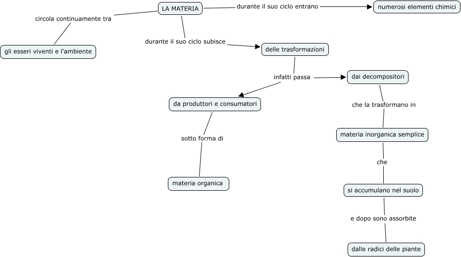 Questa Cmap, creata con IHMC CmapTools, contiene informazioni relative a: LA MATERIA, materia inorganica semplice che si accumulano nel suolo, delle trasformazioni infatti passa da produttori e consumatori, da produttori e consumatori sotto forma di materia organica, si accumulano nel suolo e dopo sono assorbite dalle radici delle piante, dai decompositori che la trasformano in materia inorganica semplice, LA MATERIA durante il suo ciclo subisce delle trasformazioni, LA MATERIA circola continuamente tra gli esseri viventi e l'ambiente, LA MATERIA durante il suo ciclo entrano numerosi elementi chimici, delle trasformazioni infatti passa dai decompositori