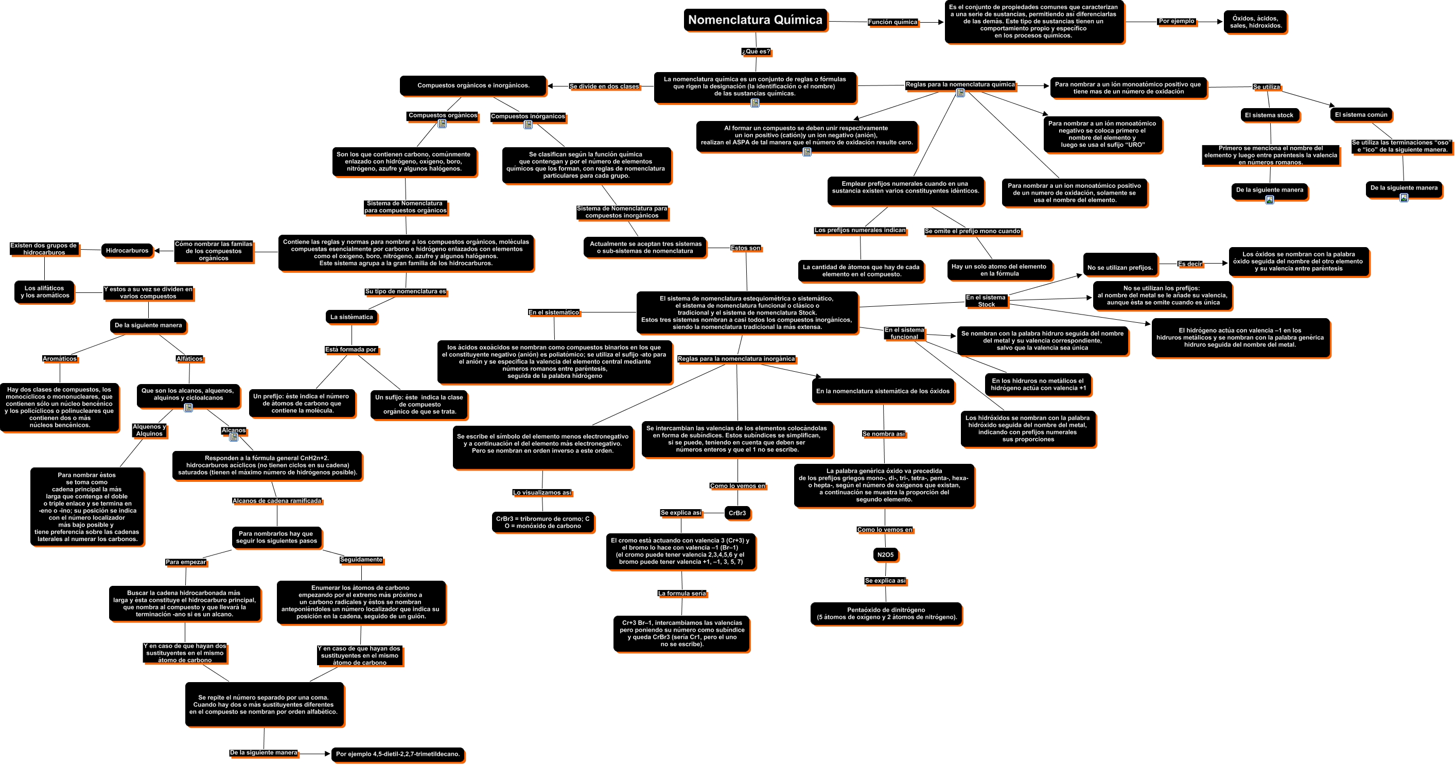 Este Cmap, tiene información relacionada con: Nomenclatura Química, De la siguiente manera Aromáticos Hay dos clases de compuestos, los monocíclicos o mononucleares, que contienen sólo un núcleo bencénico y los policíclicos o polinucleares que contienen dos o más núcleos bencénicos., La nomenclatura química es un conjunto de reglas o fórmulas que rigen la designación (la identificación o el nombre) de las sustancias químicas. Reglas para la nomenclatura química Para nombrar a un ión monoatómico positivo que tiene mas de un número de oxidación, Los alifáticos y los aromáticos Y estos a su vez se dividen en varios compuestos De la siguiente manera, El sistema de nomenclatura estequiométrica o sistemático, el sistema de nomenclatura funcional o clásico o tradicional y el sistema de nomenclatura Stock. Estos tres sistemas nombran a casi todos los compuestos inorgánicos, siendo la nomenclatura tradicional la más extensa. En el sistema Stock No se utilizan prefijos., El sistema de nomenclatura estequiométrica o sistemático, el sistema de nomenclatura funcional o clásico o tradicional y el sistema de nomenclatura Stock. Estos tres sistemas nombran a casi todos los compuestos inorgánicos, siendo la nomenclatura tradicional la más extensa. En el sistema Stock El hidrógeno actúa con valencia –1 en los hidruros metálicos y se nombran con la palabra genérica hidruro seguida del nombre del metal., De la siguiente manera Alfáticos Que son los alcanos, alquenos, alquinos y cicloalcanos, CrBr3 Se explica así El cromo está actuando con valencia 3 (Cr+3) y el bromo lo hace con valencia –1 (Br–1) (el cromo puede tener valencia 2,3,4,5,6 y el bromo puede tener valencia +1, –1, 3, 5, 7), Para nombrar a un ión monoatómico positivo que tiene mas de un número de oxidación Se utiliza El sistema stock, Emplear prefijos numerales cuando en una sustancia existen varios constituyentes idénticos. Se omite el prefijo mono cuando Hay un solo atomo del elemento en la fórmula, N2O5 Se explica así Pentaóxido de dinitrógeno (5 átomos de oxígeno y 2 átomos de nitrógeno)., Se escribe el símbolo del elemento menos electronegativo y a continuación el del elemento más electronegativo. Pero se nombran en orden inverso a este orden. Lo visualizamos así CrBr3 = tribromuro de cromo; C O = monóxido de carbono, Que son los alcanos, alquenos, alquinos y cicloalcanos Alquenos y Alquinos Para nombrar éstos se toma como cadena principal la más larga que contenga el doble o triple enlace y se termina en -eno o -ino; su posición se indica con el número localizador más bajo posible y tiene preferencia sobre las cadenas laterales al numerar los carbonos., El sistema de nomenclatura estequiométrica o sistemático, el sistema de nomenclatura funcional o clásico o tradicional y el sistema de nomenclatura Stock. Estos tres sistemas nombran a casi todos los compuestos inorgánicos, siendo la nomenclatura tradicional la más extensa. Reglas para la nomenclatura inorgánica Se escribe el símbolo del elemento menos electronegativo y a continuación el del elemento más electronegativo. Pero se nombran en orden inverso a este orden., Contiene las reglas y normas para nombrar a los compuestos orgánicos, moléculas compuestas esencialmente por carbono e hidrógeno enlazados con elementos como el oxígeno, boro, nitrógeno, azufre y algunos halógenos. Este sistema agrupa a la gran familia de los hidrocarburos. Su tipo de nomenclatura es La sistématica, Emplear prefijos numerales cuando en una sustancia existen varios constituyentes idénticos. Los prefijos numerales indican La cantidad de átomos que hay de cada elemento en el compuesto., En la nomenclatura sistemática de los óxidos Se nombra así La palabra genérica óxido va precedida de los prefijos griegos mono-, di-, tri-, tetra-, penta-, hexa- o hepta-, según el número de oxígenos que existan, a continuación se muestra la proporción del segundo elemento., Para nombrarlos hay que seguir los siguientes pasos Seguidamente Enumerar los átomos de carbono empezando por el extremo más próximo a un carbono radicales y éstos se nombran anteponiéndoles un número localizador que indica su posición en la cadena, seguido de un guión., Actualmente se aceptan tres sistemas o sub-sistemas de nomenclatura Estos son El sistema de nomenclatura estequiométrica o sistemático, el sistema de nomenclatura funcional o clásico o tradicional y el sistema de nomenclatura Stock. Estos tres sistemas nombran a casi todos los compuestos inorgánicos, siendo la nomenclatura tradicional la más extensa., Para nombrar a un ión monoatómico positivo que tiene mas de un número de oxidación Se utiliza El sistema común, No se utilizan prefijos. Es decir Los óxidos se nombran con la palabra óxido seguida del nombre del otro elemento y su valencia entre paréntesis