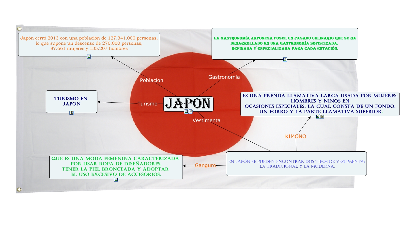 Este Cmap, tiene información relacionada con: Informatica (Japon), En Japón se pueden encontrar dos tipos de vestimenta: la tradicional y la moderna. KIMONO es una prenda llamativa larga usada por mujeres, hombres y niños en ocasiones especiales, la cual consta de un fondo, un forro y la parte llamativa superior., JAPON Poblacion Japón cerró 2013 con una población de 127.341.000 personas, lo que supone un descenso de 270.000 personas, 87.661 mujeres y 135.207 hombres, JAPON Vestimenta En Japón se pueden encontrar dos tipos de vestimenta: la tradicional y la moderna., JAPON Turismo Turismo en japon, En Japón se pueden encontrar dos tipos de vestimenta: la tradicional y la moderna. Ganguro que es una moda femenina caracterizada por usar ropa de diseñadores, tener la piel bronceada y adoptar el uso excesivo de accesorios., JAPON Gastronomia La gastronomía japonesa posee un pasado culinario que se ha desarrollado en una gastronomía sofisticada, refinada y especializada para cada estación.