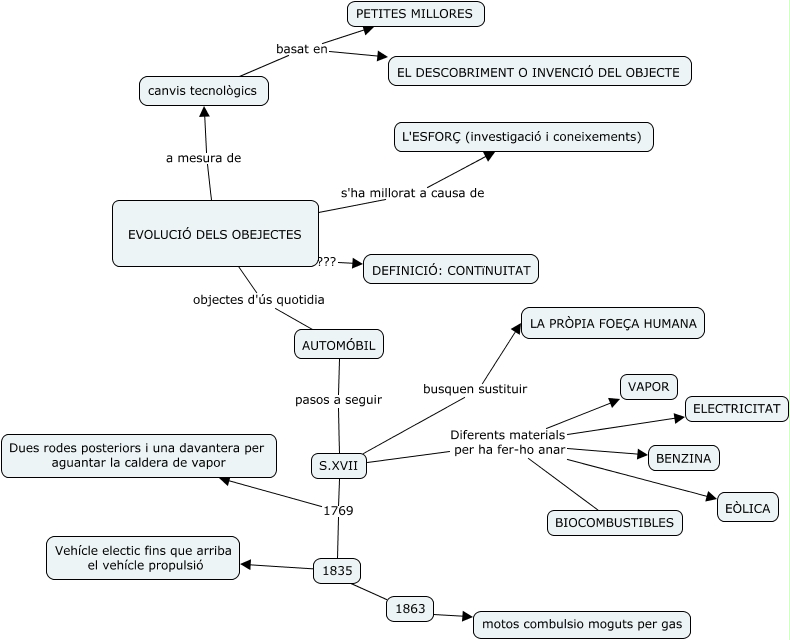 Este Cmap, tiene información relacionada con: EVOUCIO DELS OBJECTES, 1863 ???? motos combulsio moguts per gas, EVOLUCIÓ DELS OBEJECTES a mesura de canvis tecnològics, S.XVII 1769 Dues rodes posteriors i una davantera per aguantar la caldera de vapor, EVOLUCIÓ DELS OBEJECTES ???? DEFINICIÓ: CONTïNUITAT, canvis tecnològics basat en EL DESCOBRIMENT O INVENCIÓ DEL OBJECTE, S.XVII Diferents materials per ha fer-ho anar VAPOR, S.XVII Diferents materials per ha fer-ho anar BIOCOMBUSTIBLES, 1835 ???? 1863, S.XVII Diferents materials per ha fer-ho anar BENZINA, S.XVII busquen sustituir LA PRÒPIA FOEÇA HUMANA, S.XVII 1769 1835, S.XVII Diferents materials per ha fer-ho anar ELECTRICITAT, AUTOMÓBIL pasos a seguir S.XVII, 1835 ???? Vehícle electic fins que arriba el vehícle propulsió, S.XVII Diferents materials per ha fer-ho anar EÒLICA, EVOLUCIÓ DELS OBEJECTES objectes d'ús quotidia AUTOMÓBIL, EVOLUCIÓ DELS OBEJECTES s'ha millorat a causa de L'ESFORÇ (investigació i coneixements), canvis tecnològics basat en PETITES MILLORES