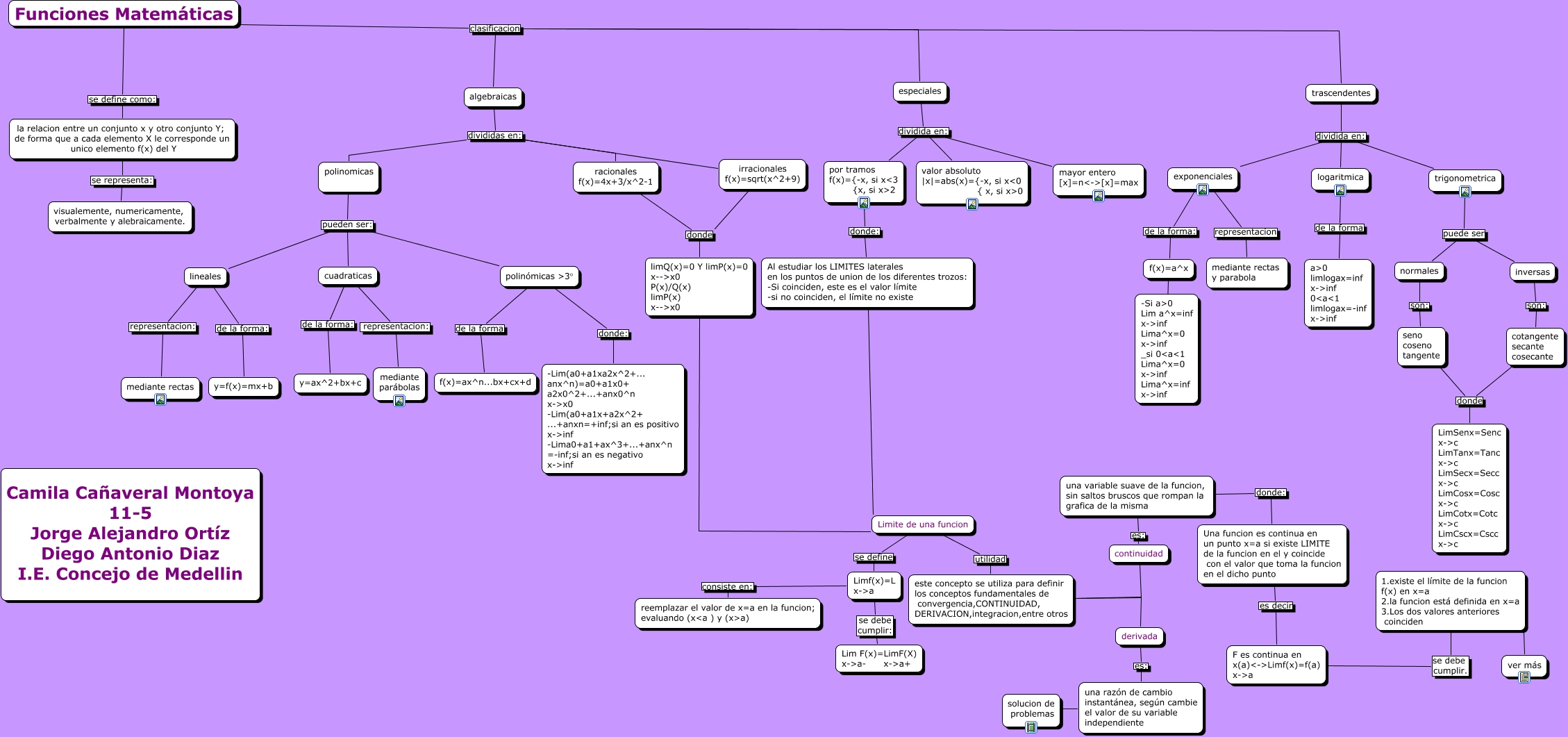 Este Cmap, tiene información relacionada con: MAPA-FUNCIONES, LIMITES, DERIBADA, CONTINUIDAD, polinomicas pueden ser: lineales, este concepto se utiliza para definir los conceptos fundamentales de convergencia,CONTINUIDAD, DERIVACION,integracion,entre otros continuidad, trigonometrica puede ser normales, cotangente secante cosecante donde LimSenx=Senc x->c LimTanx=Tanc x->c LimSecx=Secc x->c LimCosx=Cosc x->c LimCotx=Cotc x->c LimCscx=Cscc x->c, continuidad es: una variable suave de la funcion, sin saltos bruscos que rompan la grafica de la misma, Funciones Matemáticas clasificacion algebraicas, inversas son: cotangente secante cosecante, cuadraticas representacion: mediante parábolas, especiales dividida en: valor absoluto |x|=abs(x)={-x, si xɘ { x, si xɬ, especiales dividida en: mayor entero [x]=n<->[x]=max, Funciones Matemáticas se define como: la relacion entre un conjunto x y otro conjunto Y; de forma que a cada elemento X le corresponde un unico elemento f(x) del Y, trascendentes dividida en: exponenciales, ver más 1.existe el límite de la funcion f(x) en x=a 2.la funcion está definida en x=a 3.Los dos valores anteriores coinciden, este concepto se utiliza para definir los conceptos fundamentales de convergencia,CONTINUIDAD, DERIVACION,integracion,entre otros derivada, Limite de una funcion se define Limf(x)=L x->a, derivada es: una razón de cambio instantánea, según cambie el valor de su variable independiente, algebraicas divididas en: irracionales f(x)=sqrt(x^2+9), trascendentes dividida en: logaritmica, Limf(x)=L x->a consiste en: reemplazar el valor de x=a en la funcion; evaluando (x<a ) y (x>a), irracionales f(x)=sqrt(x^2+9) donde limQ(x)=0 Y limP(x)=0 x-->x0 P(x)/Q(x) limP(x) x-->x0